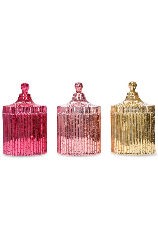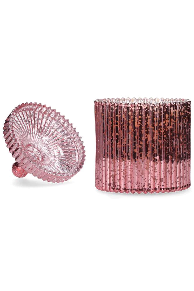 A lovely medium sized candle in a speckled rose gold glass jar