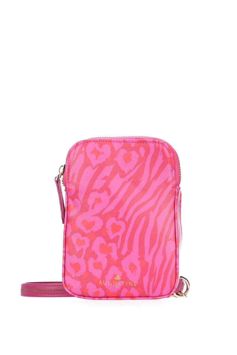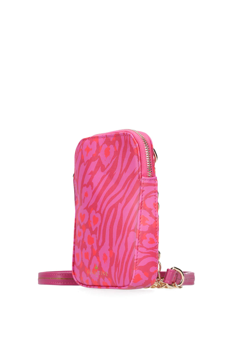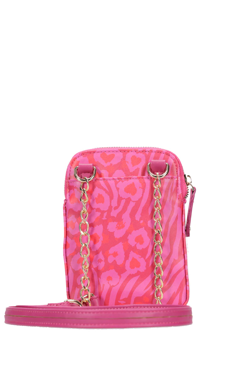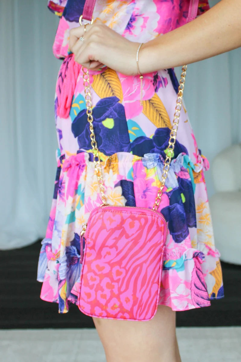 A exclusive pink leopard print phone sling, with a gold chain shoulder strap.