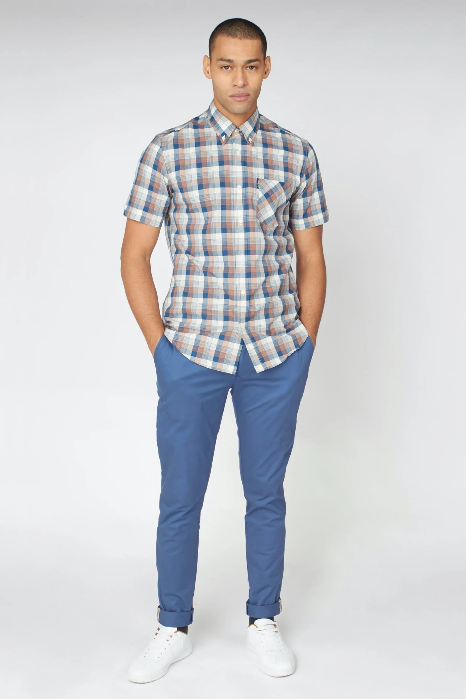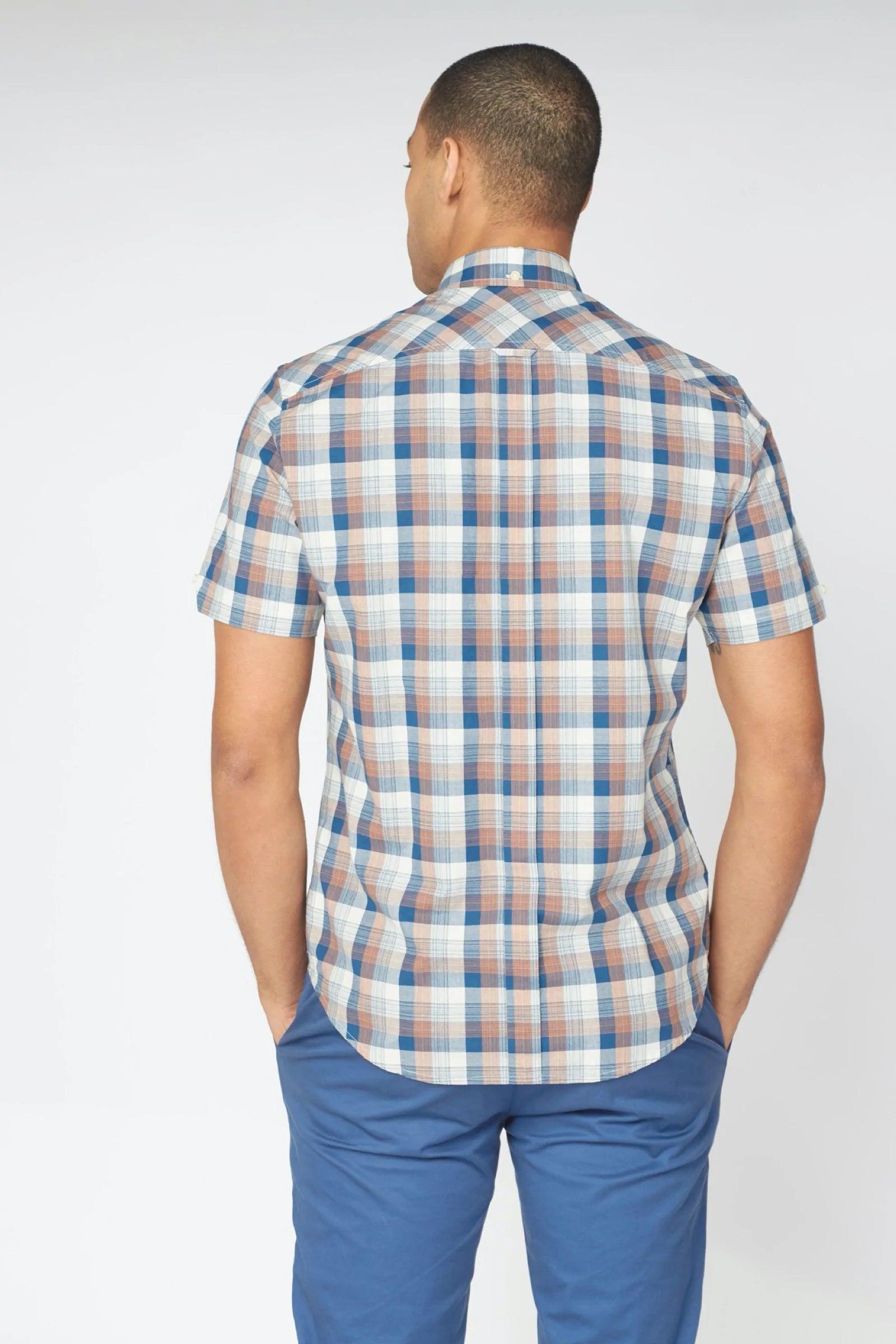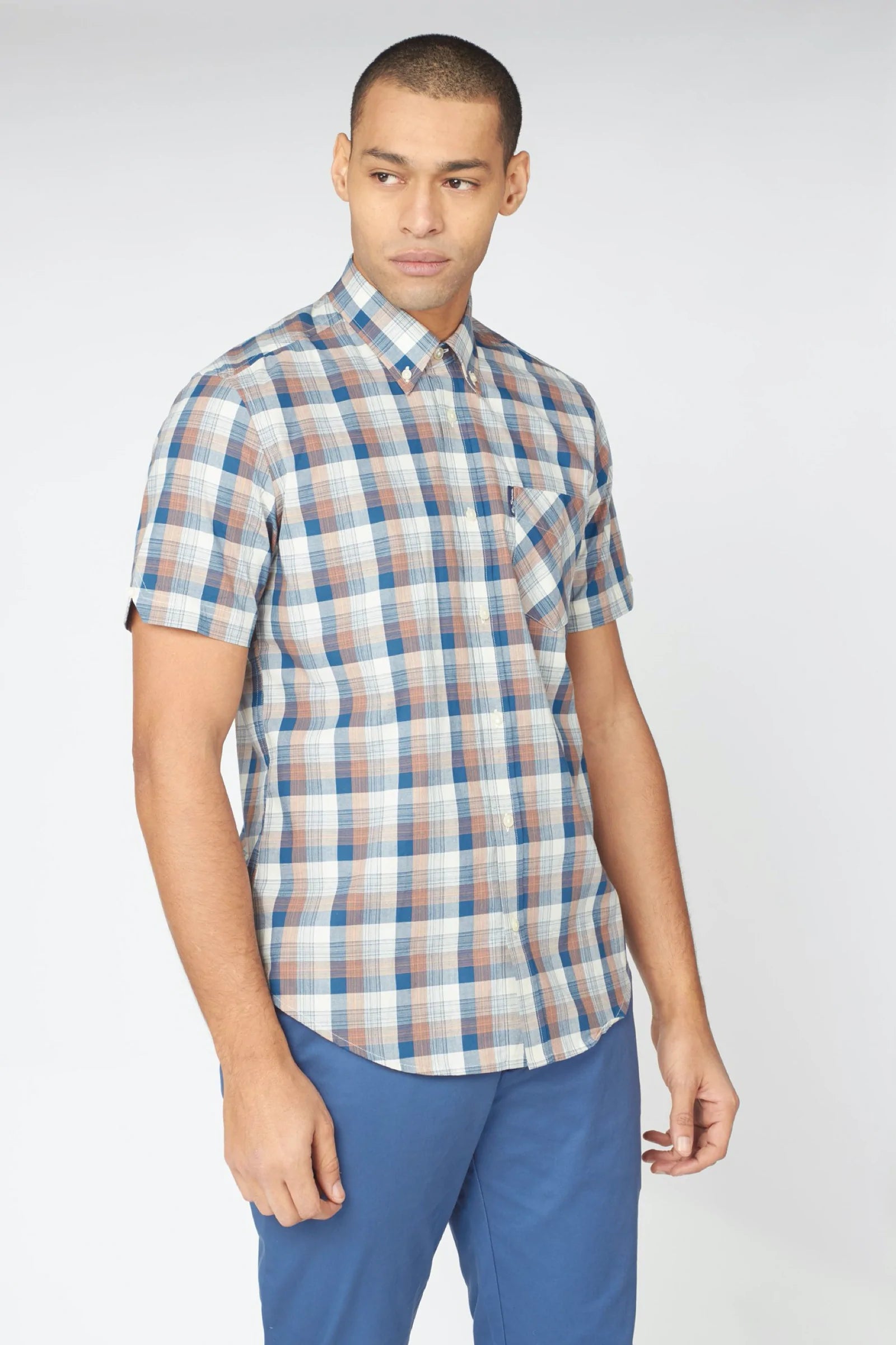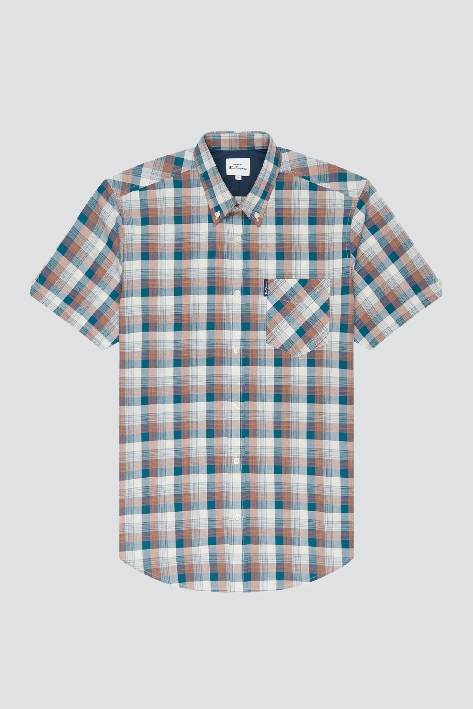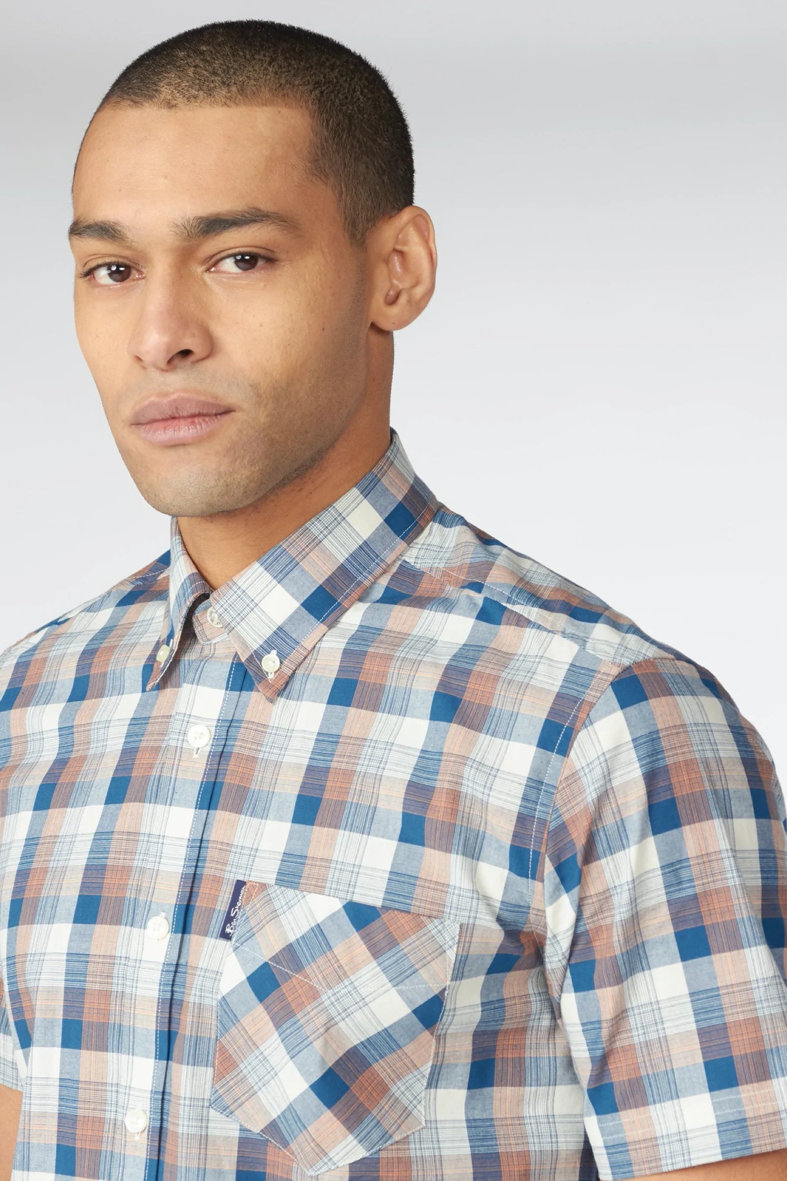 A stylish gradient check shirt by Ben Sherman - with a two finger button down collar, the iconic Ben Sherman branding and short sleeves.