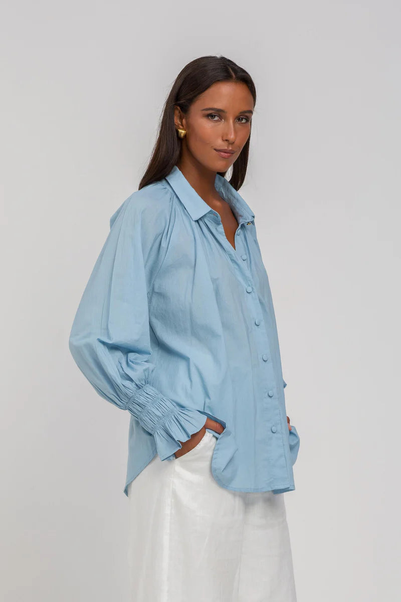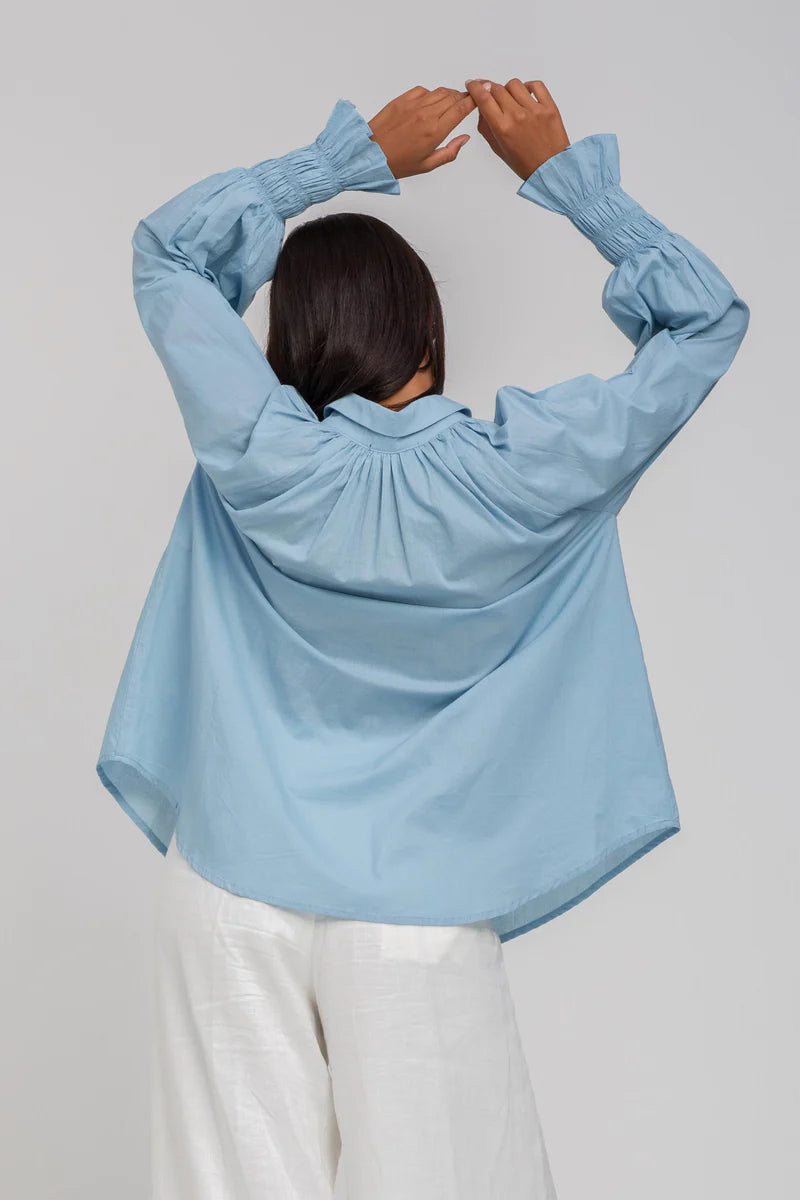 Elevate your outfit with the Edith Shirt in Dreamy Blue. Featuring exquisite shirring details and a relaxed fit, this shirt boasts a scooped hemline and a button-through front. The raglan sleeves add a touch of elegance, while the neckline gathers onto the collar for a flattering effect. Made with luxurious cotton voile, this shirt is perfect for adding a touch of sophistication to any wardrobe.