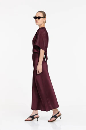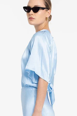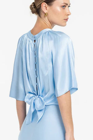 Elevated and impossibly chic, the Euphoria Dress drapes in glossy satin that moves with liquid softness. The gathered neckline and flutter sleeves create a refined, sculptural shape, balanced by a sleek bias-cut skirt that skims the body. A delicate button-back detail and self-tie waist bow add a touch of drama from behind, making this a true event-ready standout in its luminous diamond-blue hue.
