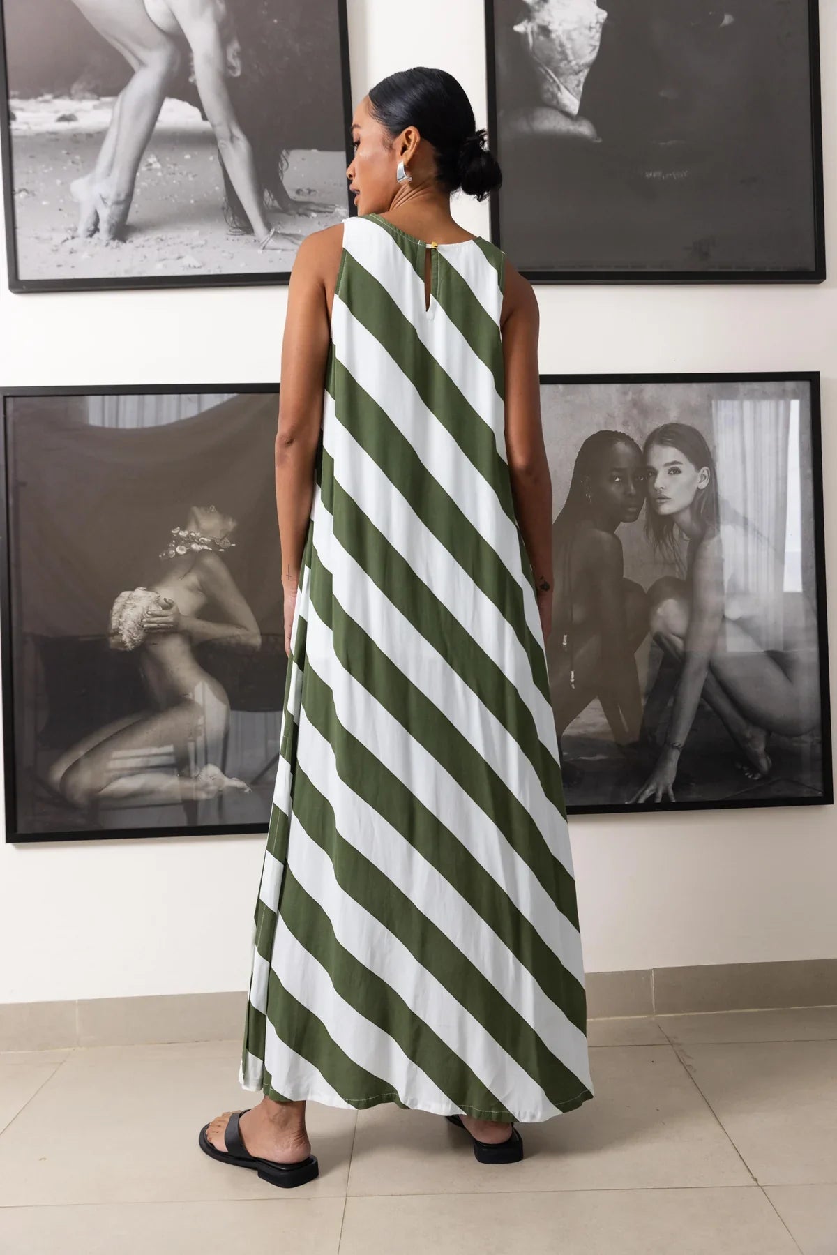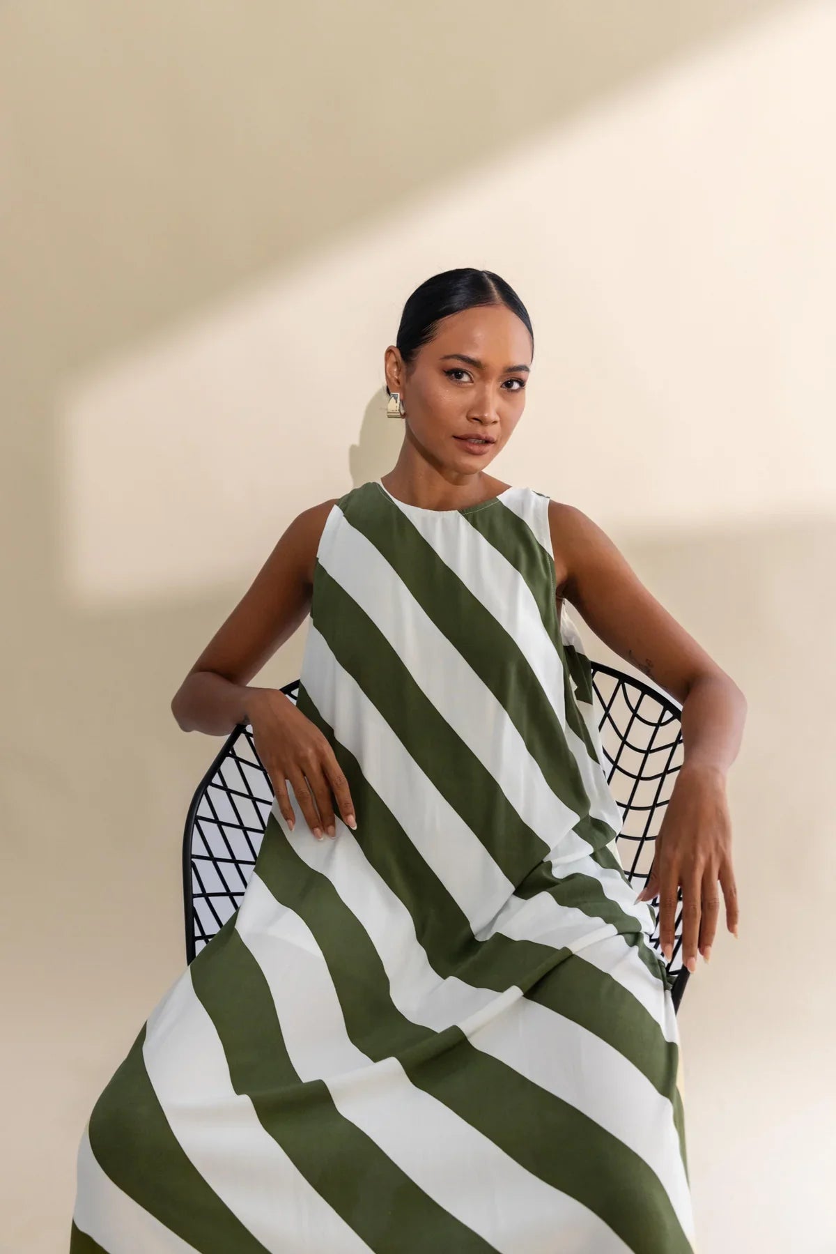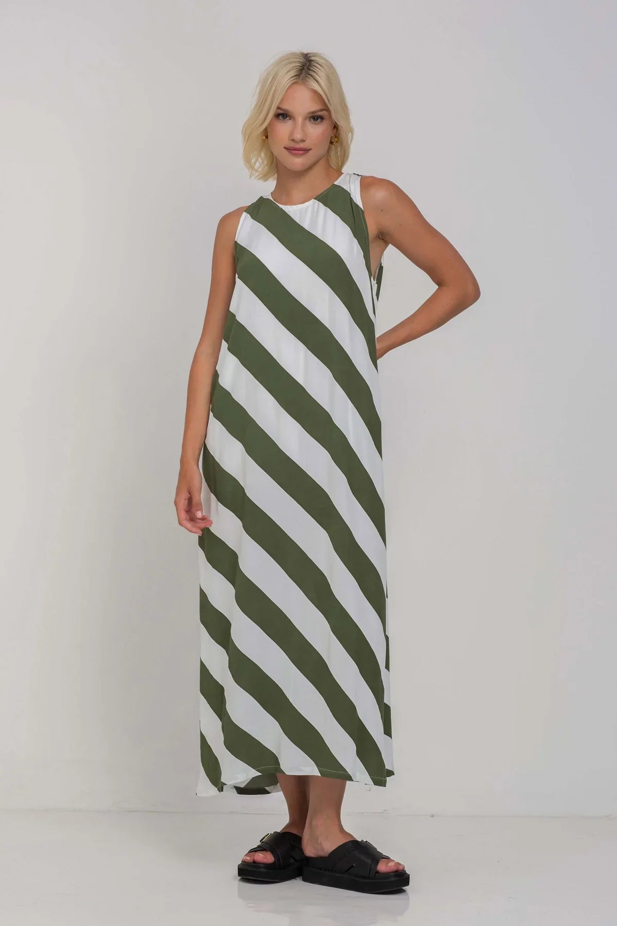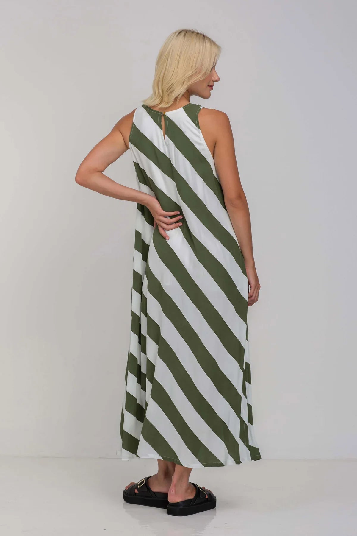 Experience the long-awaited return of our iconic silhouette! Be daring and embrace the stunning exclusive dried mint and ivory diagonal stripe pattern in luxurious viscose. This dress, with its high round neck and sleeveless design, invites you to step out of your comfort zone and embark on new adventures. Complete with a back neck keyhole and button closure, as well as side splits, the Finally Here Dress exudes a comfortable and flattering fit for all body types.