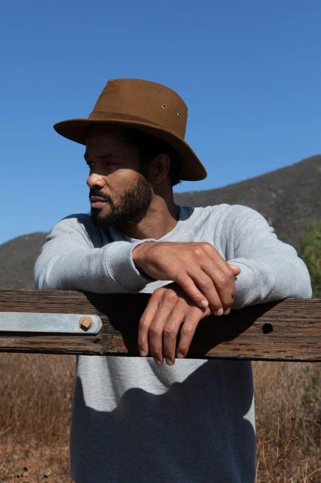 This version of our Messer Fedora is designed for travel and daily transit. Made with lightly structured cotton, it has an antimicrobial and moisture-wicking sweatband to keep you cool. Adjust your fit with the inner Velcro strap while rivets allow for extra airflow. Elevated with a 100% genuine suede leather band and a metal crest pin.