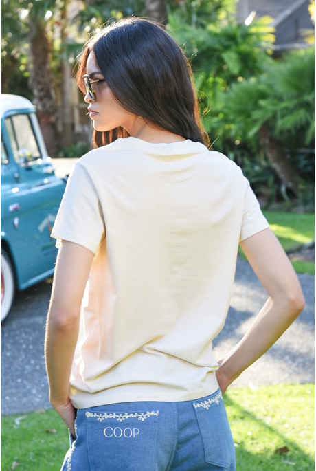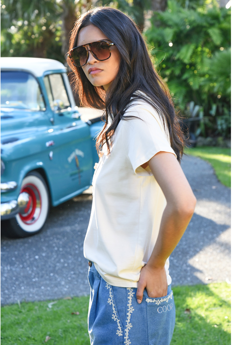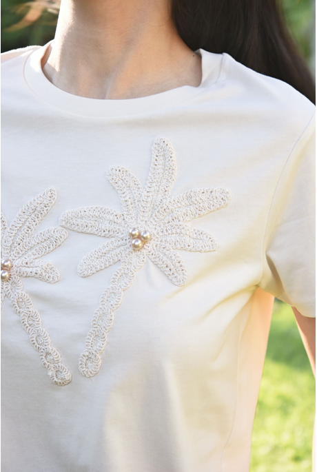 Elevating a wardrobe staple, the ‘Calm Your Palm’ t-shirt offers a unique take with its tropical inspiration. Sporting a classic fit, this tee, crafted in the ‘Tee Breeze’ cotton shirting, showcases a crochet embellished palm motif complete with self-colour beads.