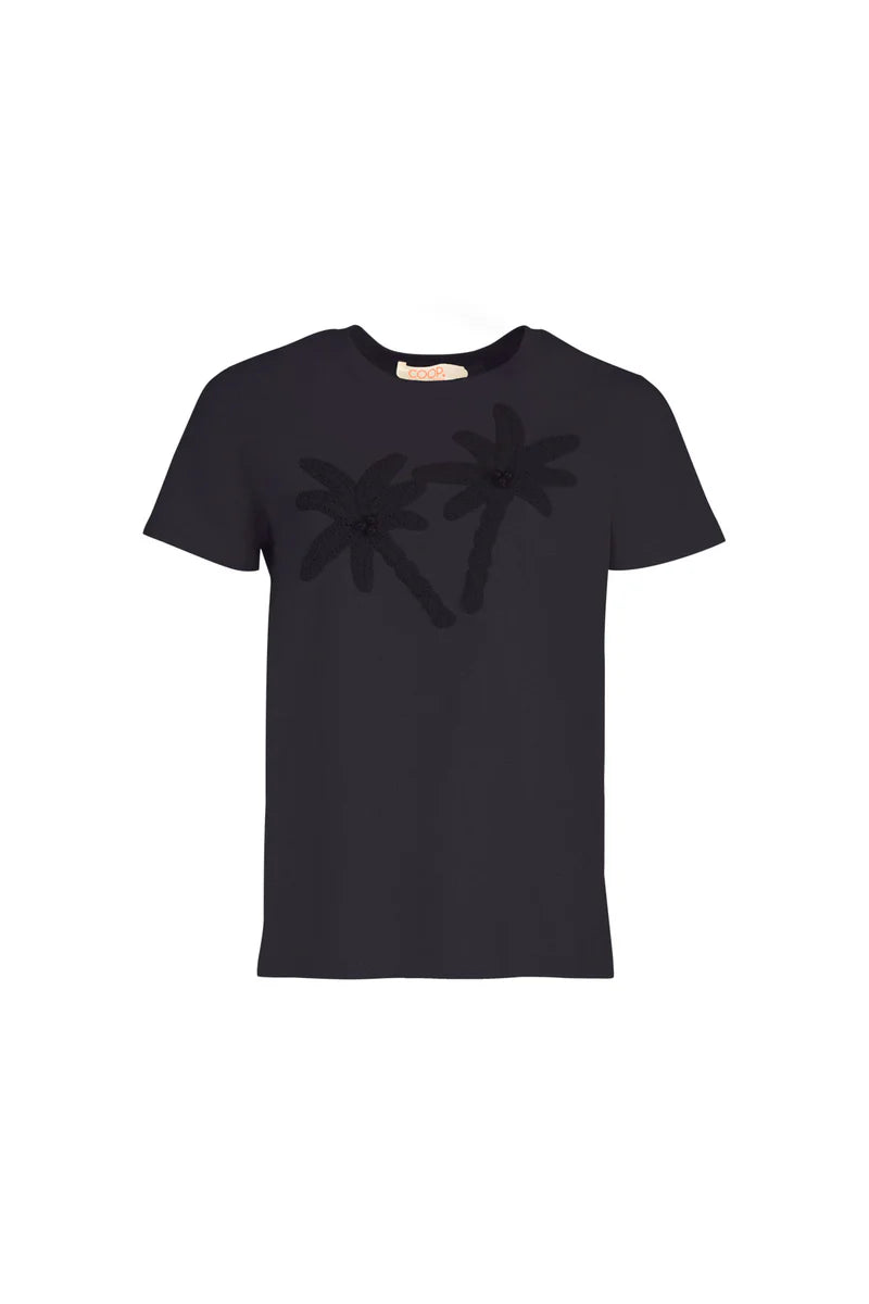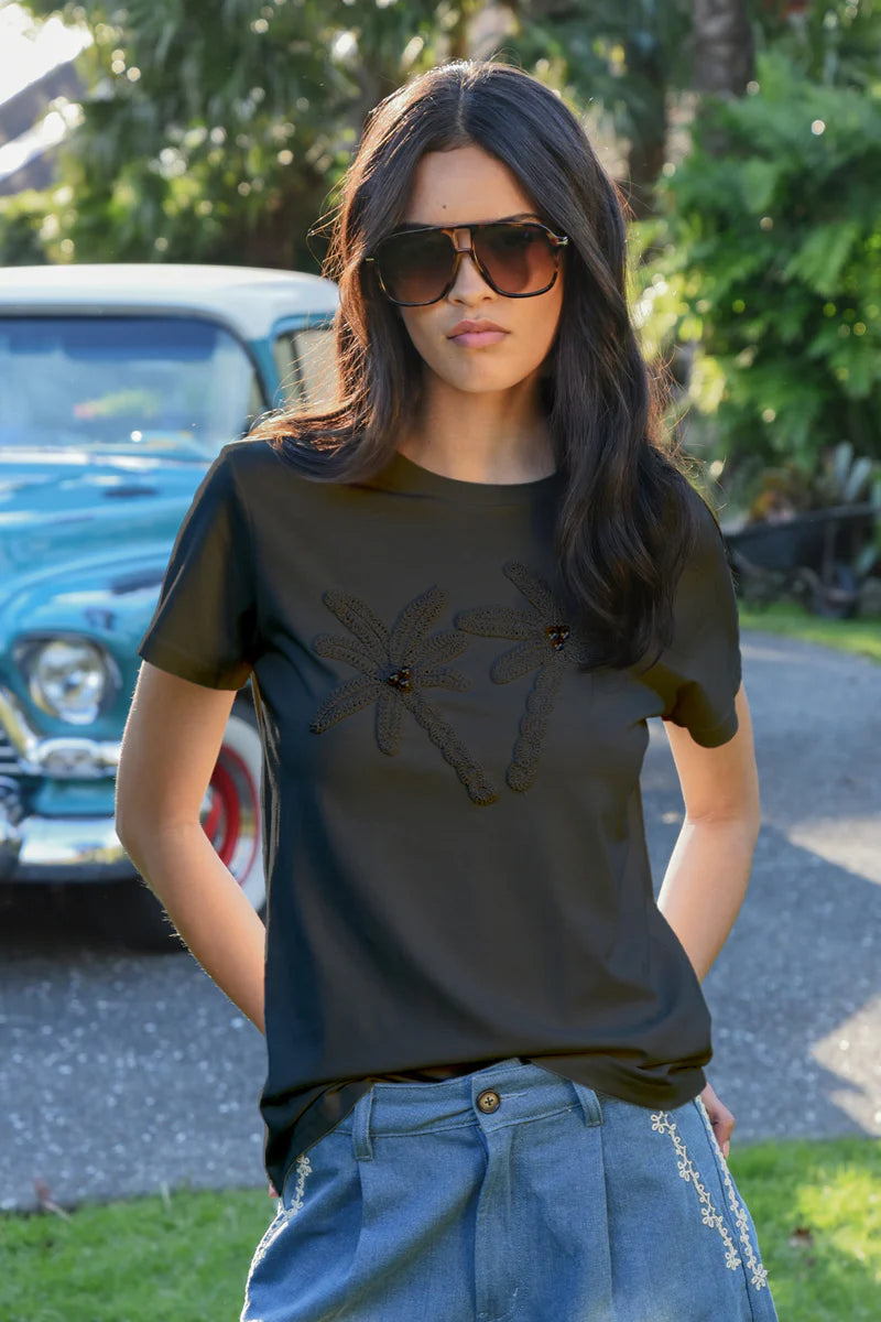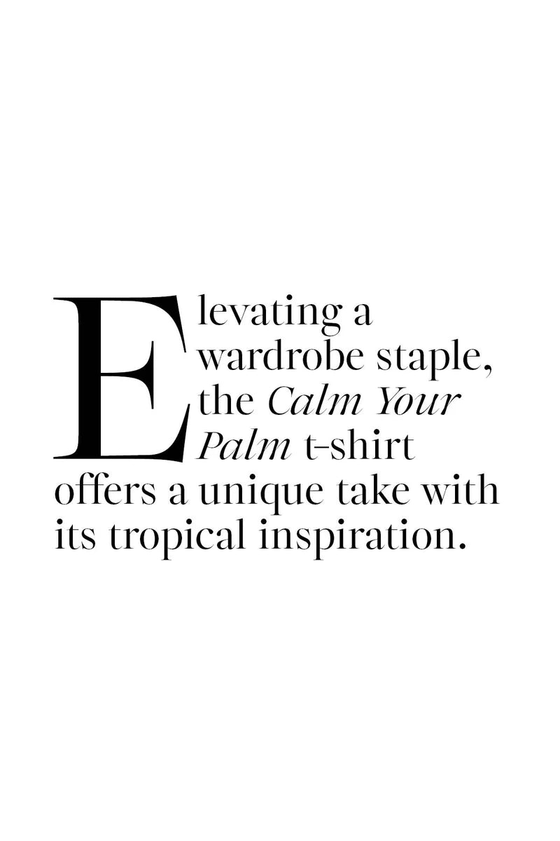 Elevating a wardrobe staple, the ‘Calm Your Palm’ t-shirt offers a unique take with its tropical inspiration. Sporting a classic fit, this tee, crafted in the ‘Tee Breeze’ cotton shirting, showcases a crochet embellished palm motif complete with self-colour beads.