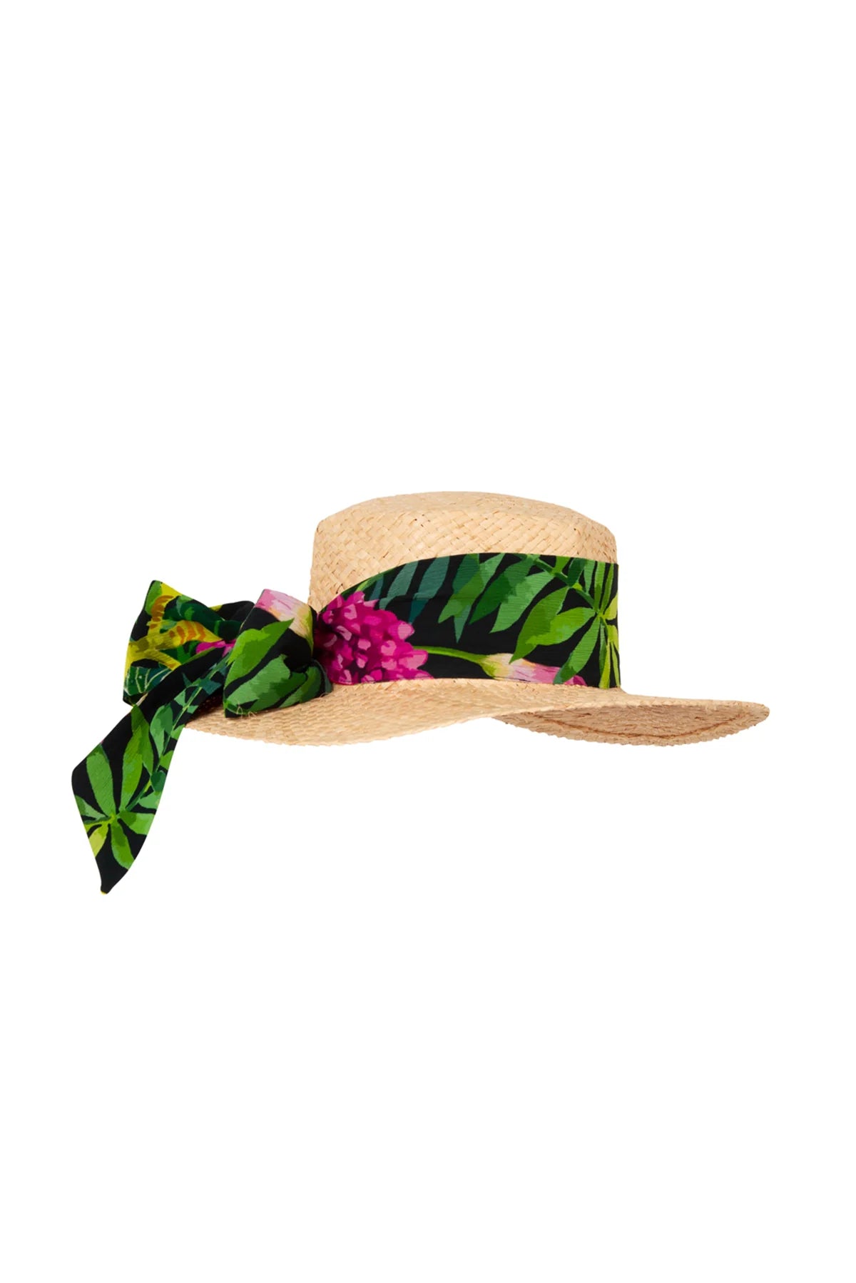 Stay sun-smart while looking like a fashion icon in the ‘Hat Trick’ hat. Crafted in a light colour straw, this hat features a tropical fabric tie to add a pop of colour to any simple outfit!