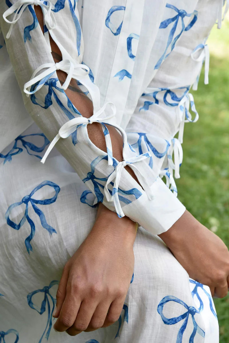 Gauzy ramie and a delicate bow print come together in the ‘Here We Bow Again’ dress. Open sleeves adorned with intricate bows add a unique touch to this classic shirt dress. Crafted in the lightweight ‘Cupid’s Bow’ fabric, this dress sports a pleated skirt that falls to a midi length for a demure touch.
