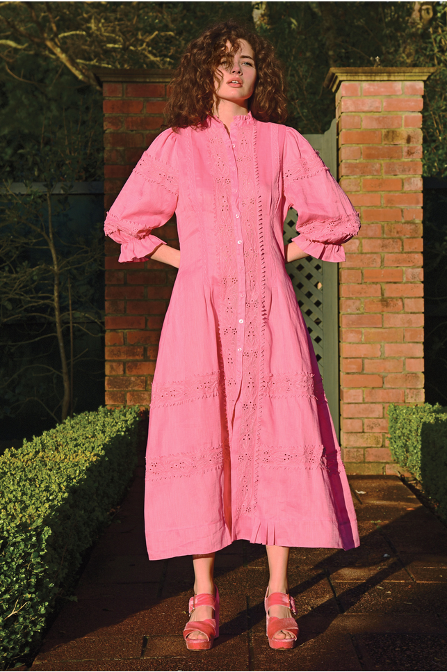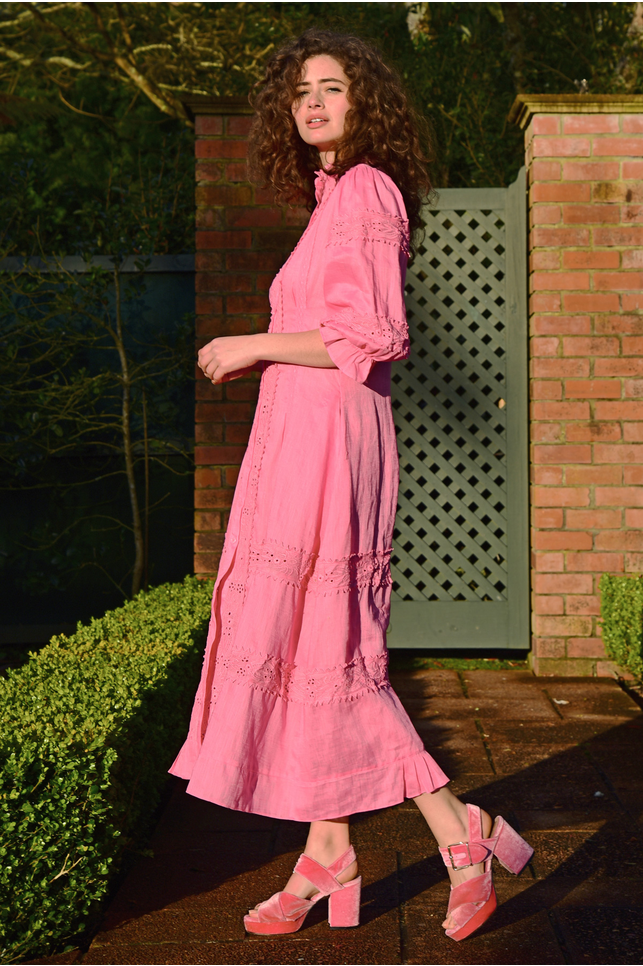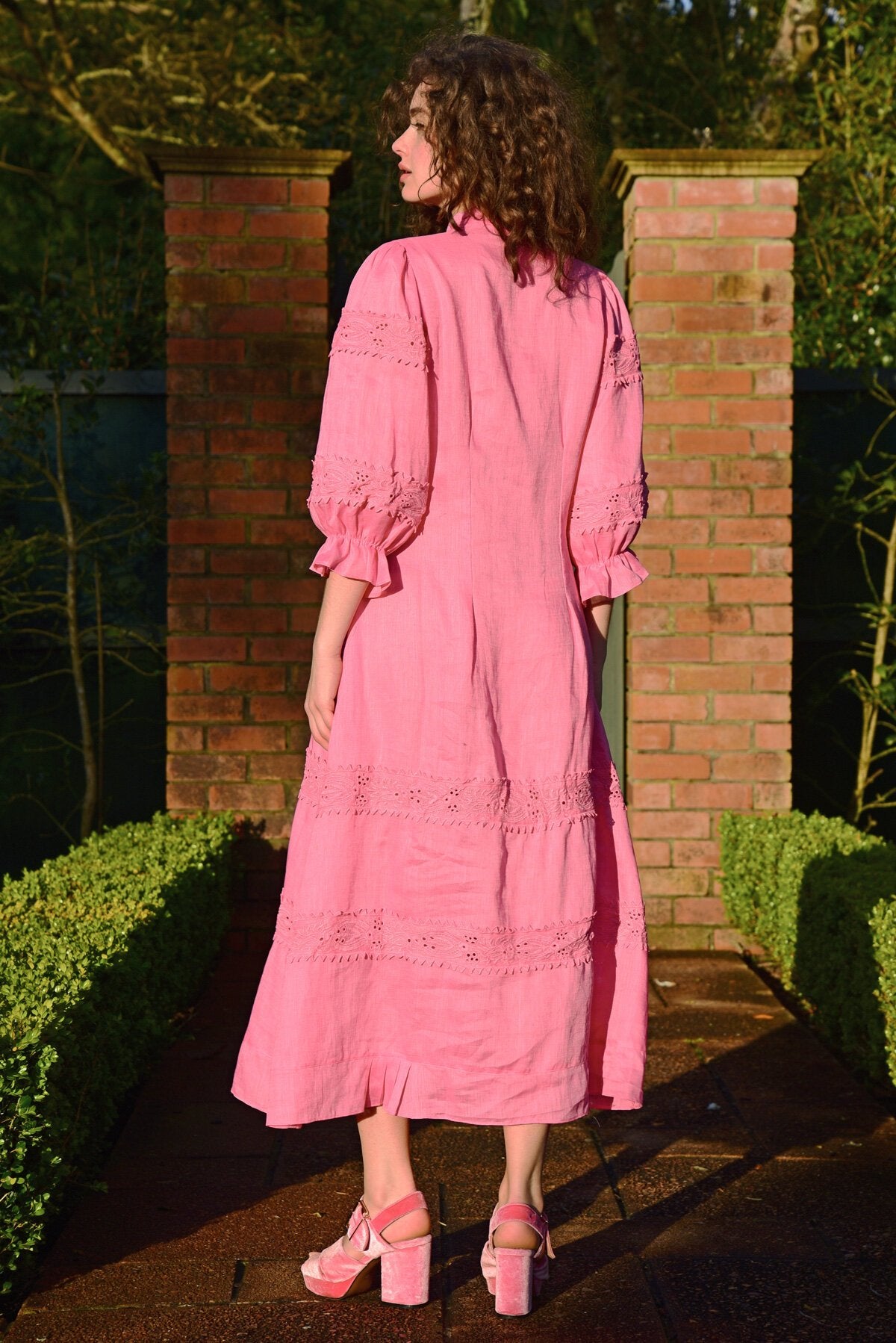 Elegance and practicality is what this dress is about. Introducing the 'Lace Value' dress in our 'Lace Station' fabrication. Made from linen, this dress is adorned with a lace panel running through the front of the dress, through the sleeves and skirt. Gathered puff sleeves and a lace trimmed stand collar give a dramatic touch to this fabulous dress.