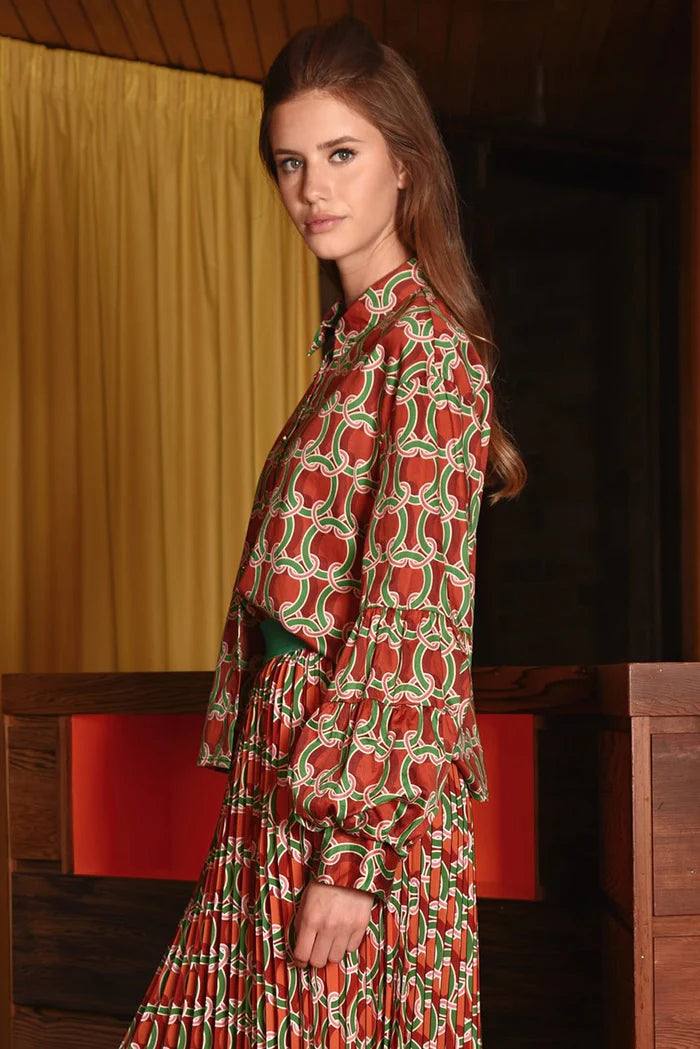Showcasing the rich hues of winter, the ‘Mood Ring’ shirt crafted in the ‘Chain Reaction’ cotton sateen is not your average shirt. Designed with a simple button up front and traditional collar this shirt is set apart by its exaggerated balloon sleeves. Pair it with the ‘We’ll Pleat Again’ skirt for a co-ordinated, high fashion outfit.
