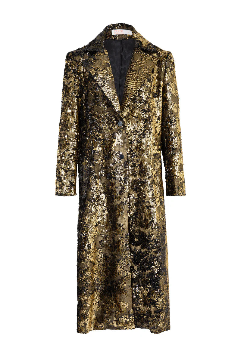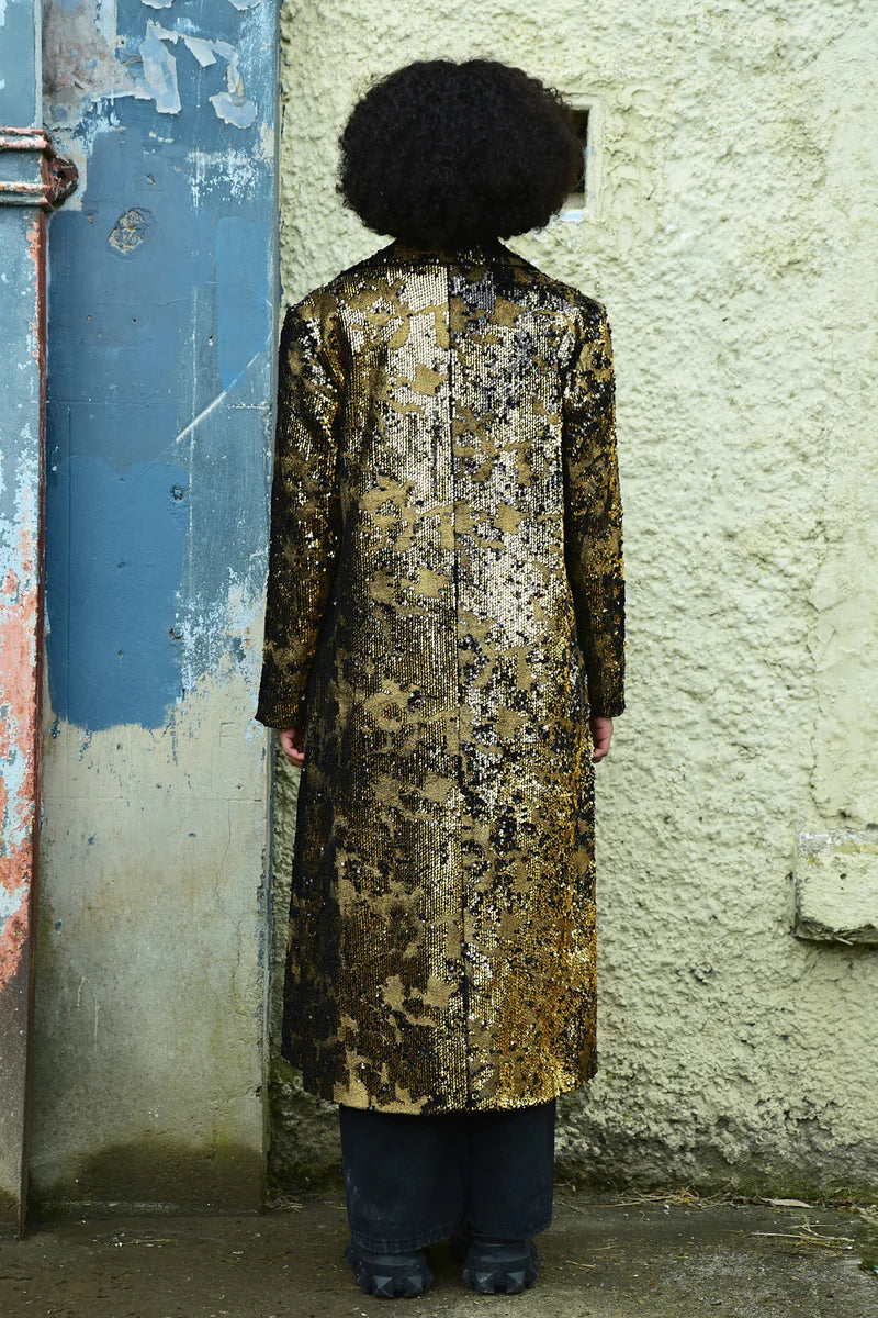 Showcase glam grunge in the showstopping ‘Rock the Coat’ coat. Fashioned out of the ‘Streets of Gold’ shimmering velvet fabric loaded with irregular sequins, this coat spells out rock star. As a coveted piece that will hold a place in your wardrobe for years to come this coat should be worn for all occasions! Pair it over your favourite LBD or wear it the casual, cool, COOP way with a t-shirt and relaxed jeans. Show this one off every day as it’s certainly not just for best!