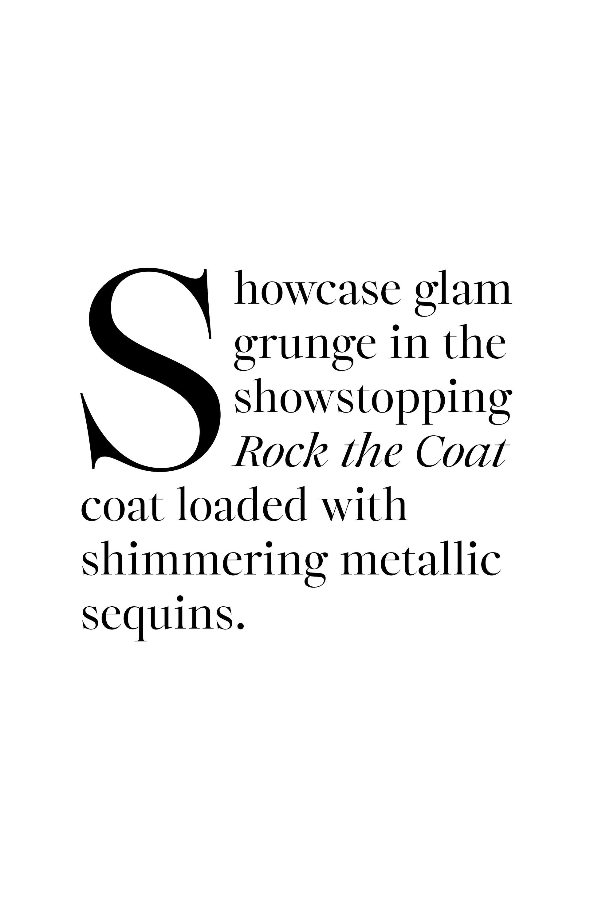 Showcase glam grunge in the showstopping ‘Rock the Coat’ coat. Fashioned out of the ‘Streets of Gold’ shimmering velvet fabric loaded with irregular sequins, this coat spells out rock star. As a coveted piece that will hold a place in your wardrobe for years to come this coat should be worn for all occasions! Pair it over your favourite LBD or wear it the casual, cool, COOP way with a t-shirt and relaxed jeans. Show this one off every day as it’s certainly not just for best!