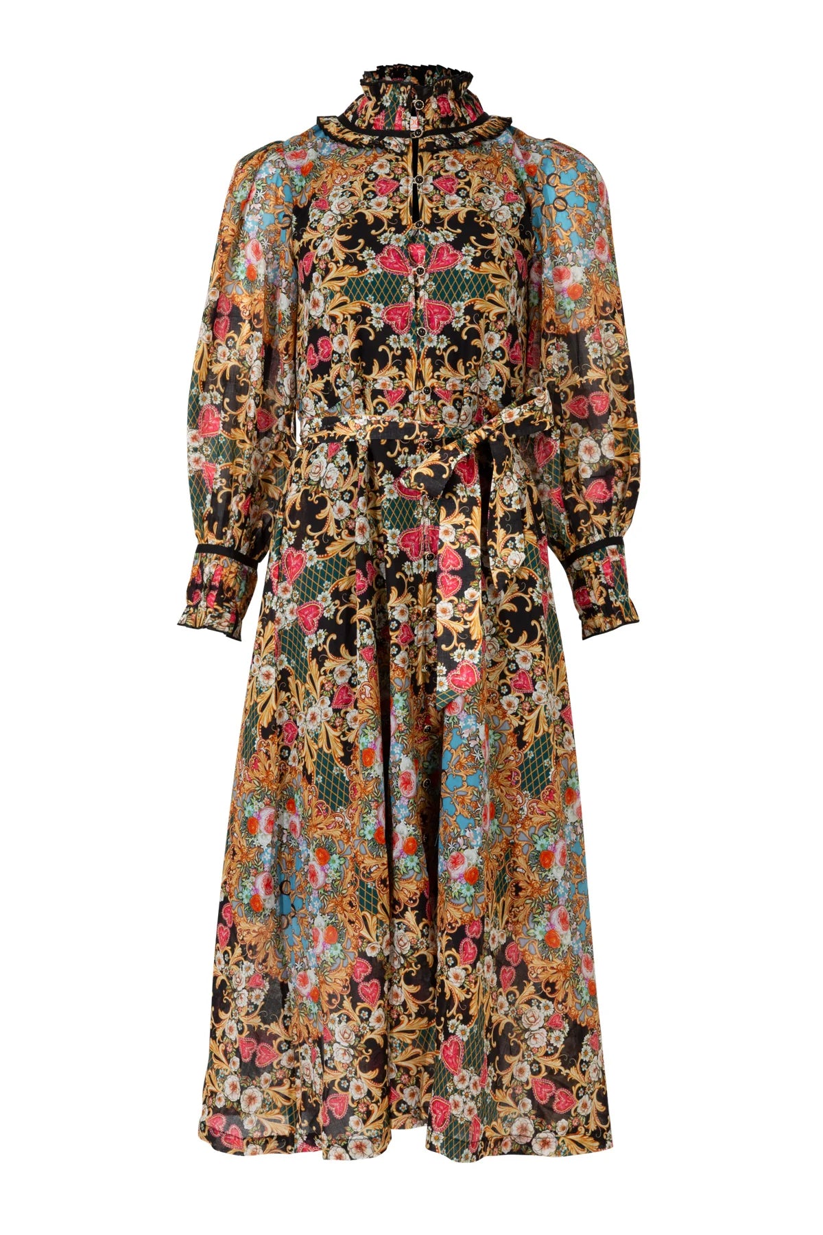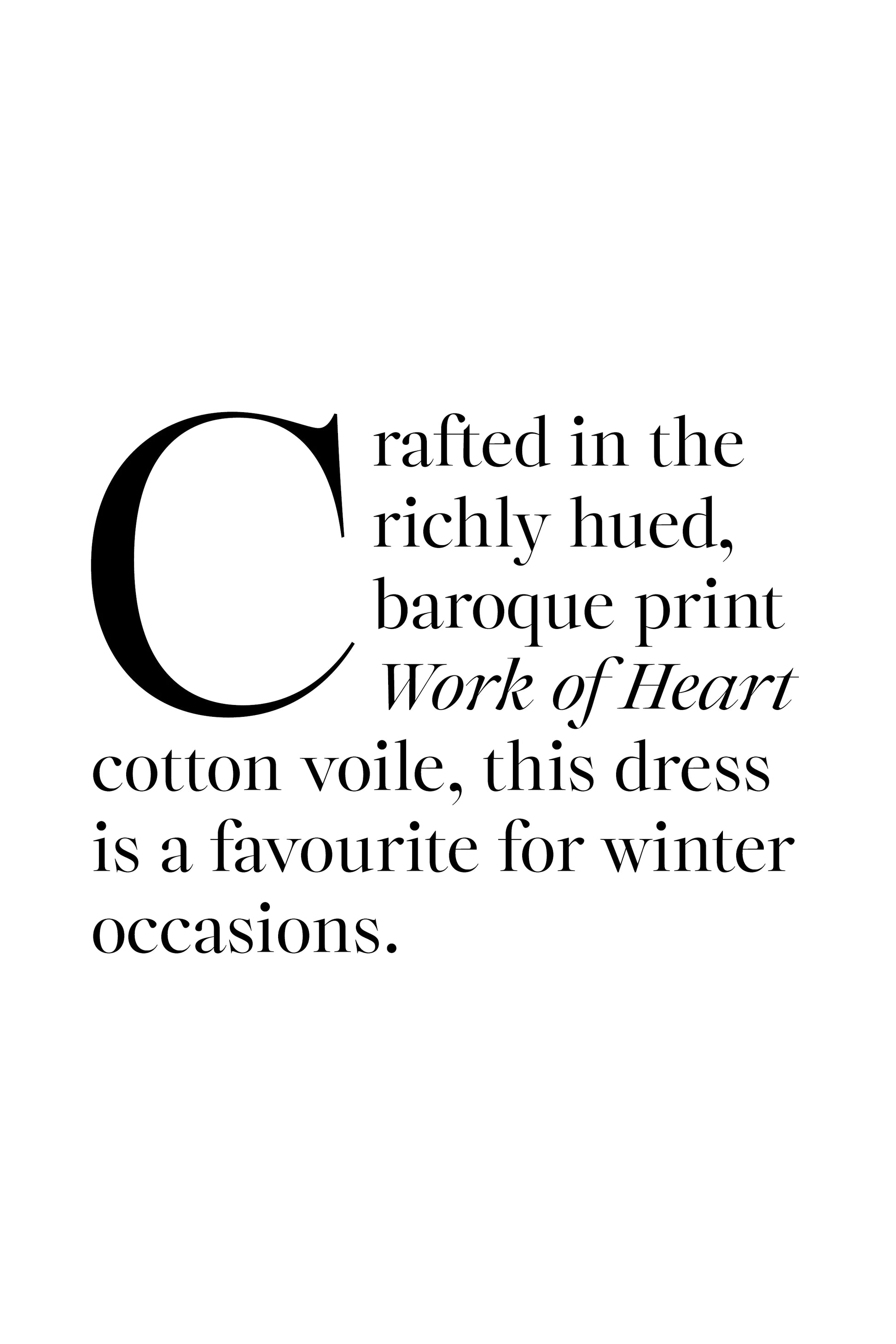 Exude regal flair in the ‘Tuck on You’ dress. Crafted in the richly hued, baroque print ‘Work of Heart’ cotton voile, this dress is a favourite for winter occasions. A pleated stand collar, a rouleau loop button through front and exaggerated balloon sleeves make this and outstanding piece, sure to turn heads!