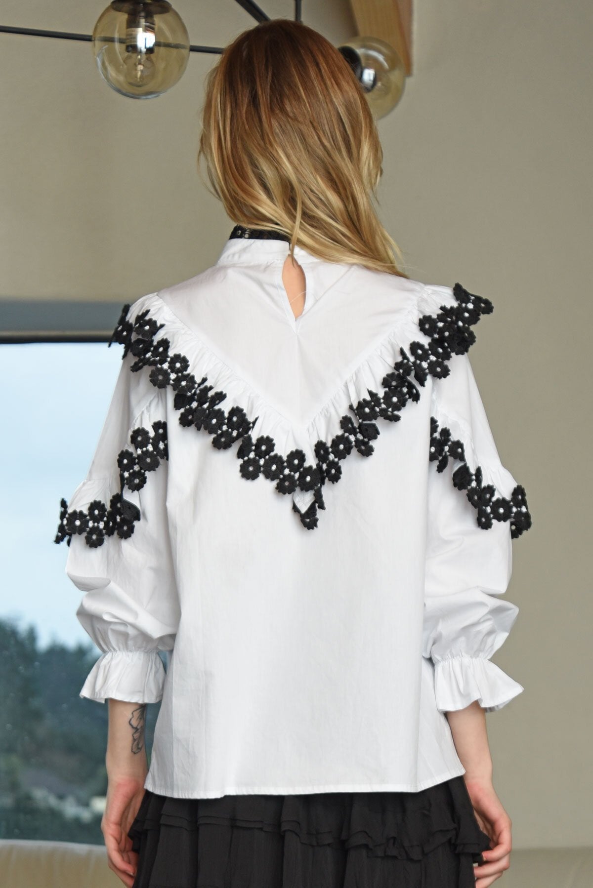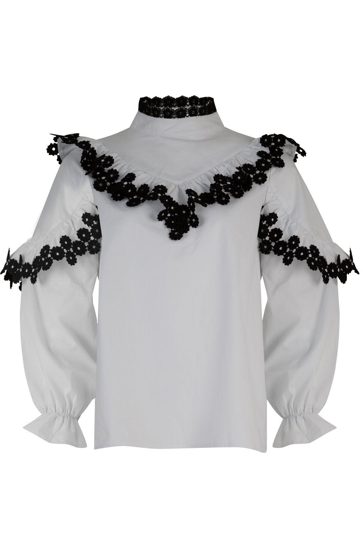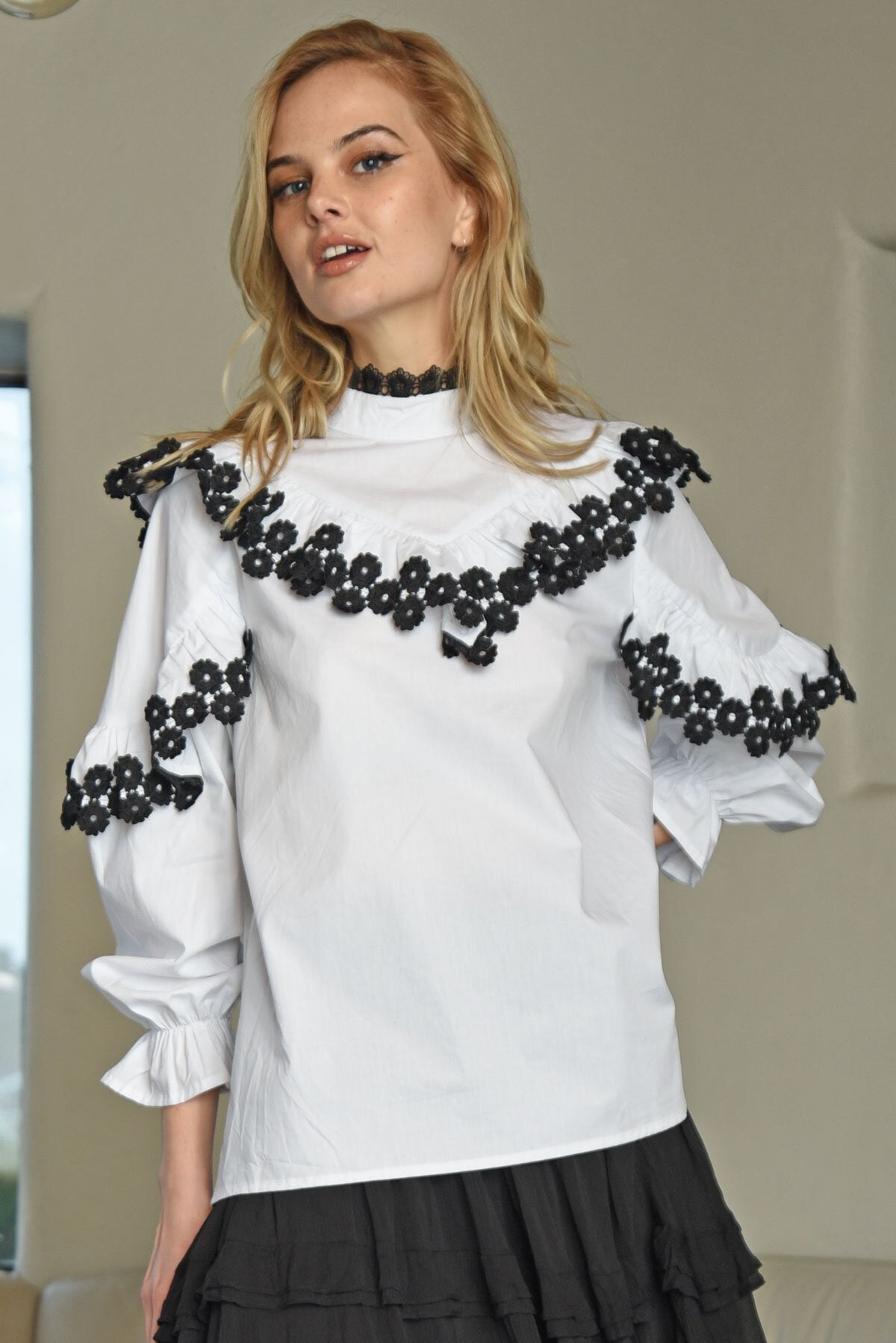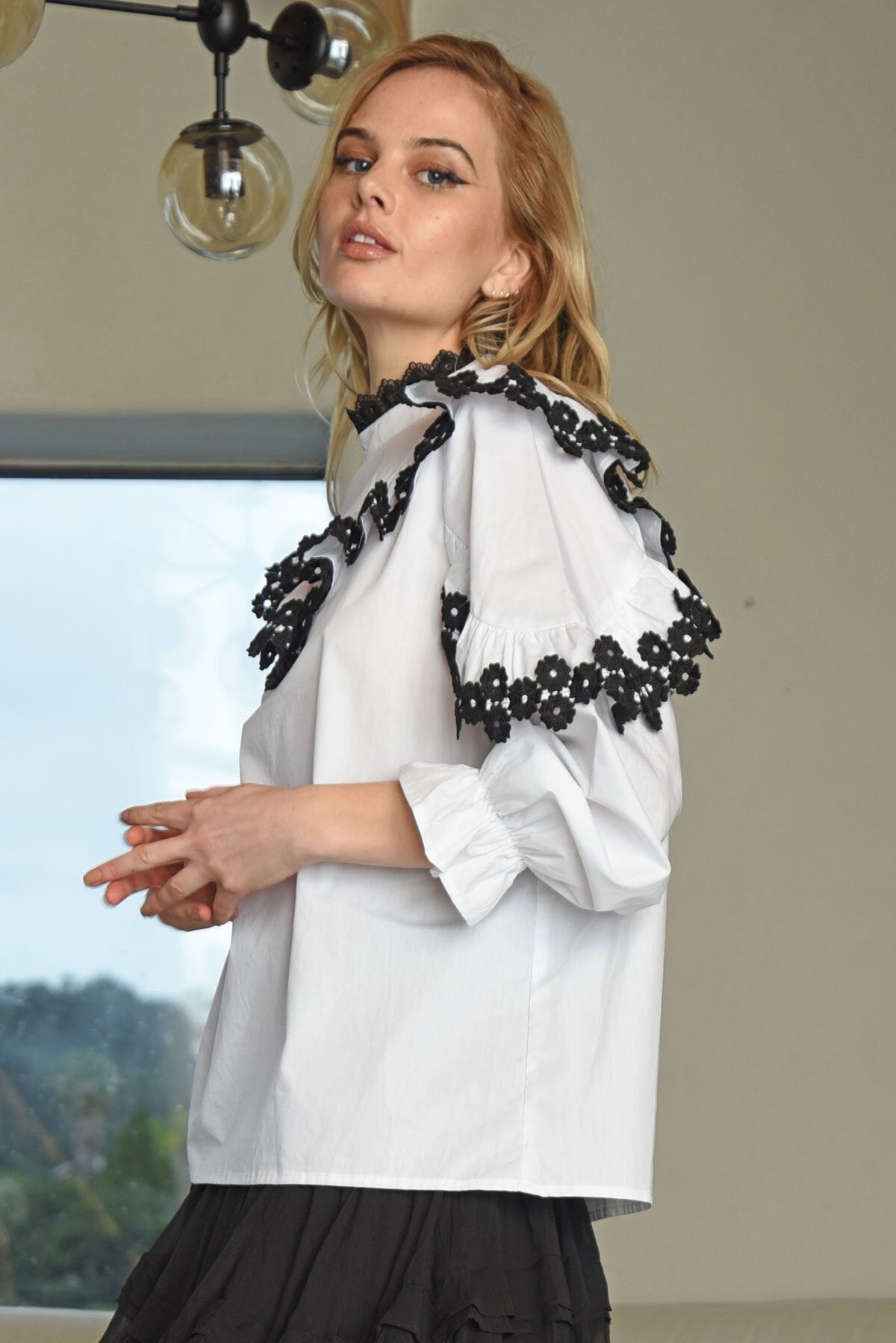 Bring the drama this season with the theatrical 'V To My Heart' blouse. Designed in the crisp 'Pop Up' cotton poplin fabric this blouse features a demure high neck, V shaped flounce, and flounce detailing on sleeve trimmed with a delicately, sweet floral lace trim.