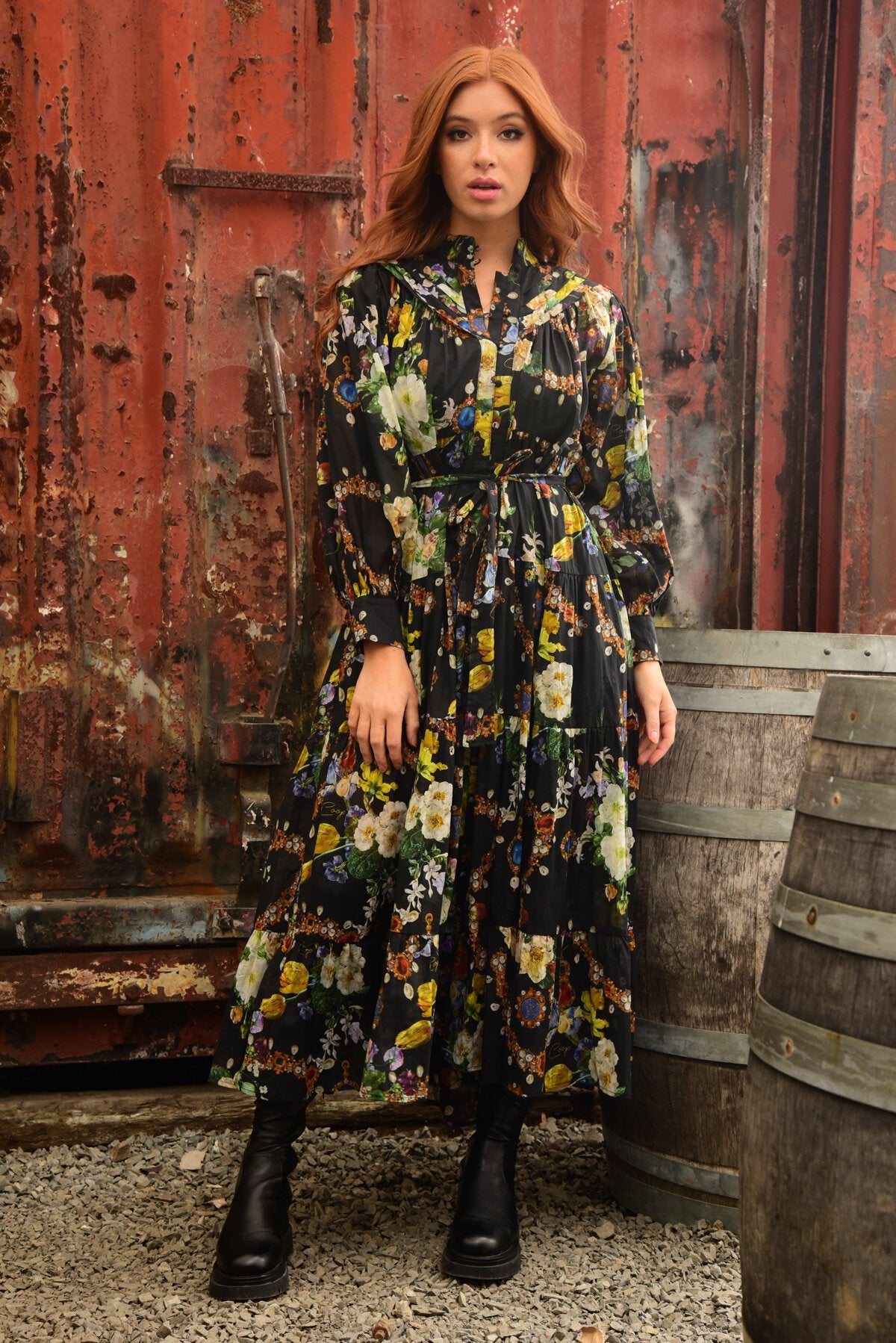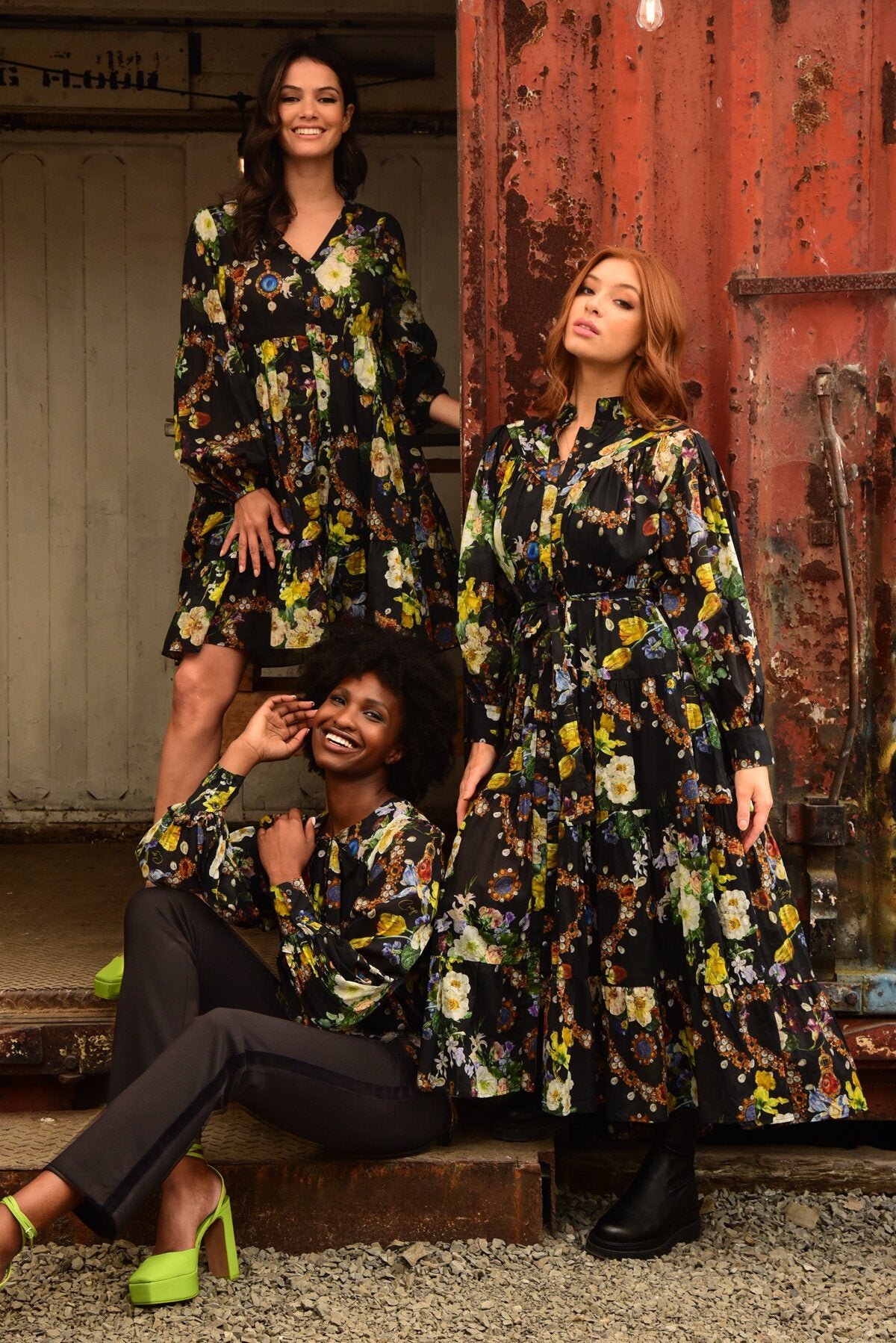 Encapsulating rich winter colours the ‘V You In My Dreams’ dress crafted in the ‘You’re A Gem’ cotton voile fabric is the perfect piece to see you through the season. With voluminous tiers, billowy sleeves and a button down front this piece looks great on its own or switch it up and wear it open over pants for an effortless lightweight layer.