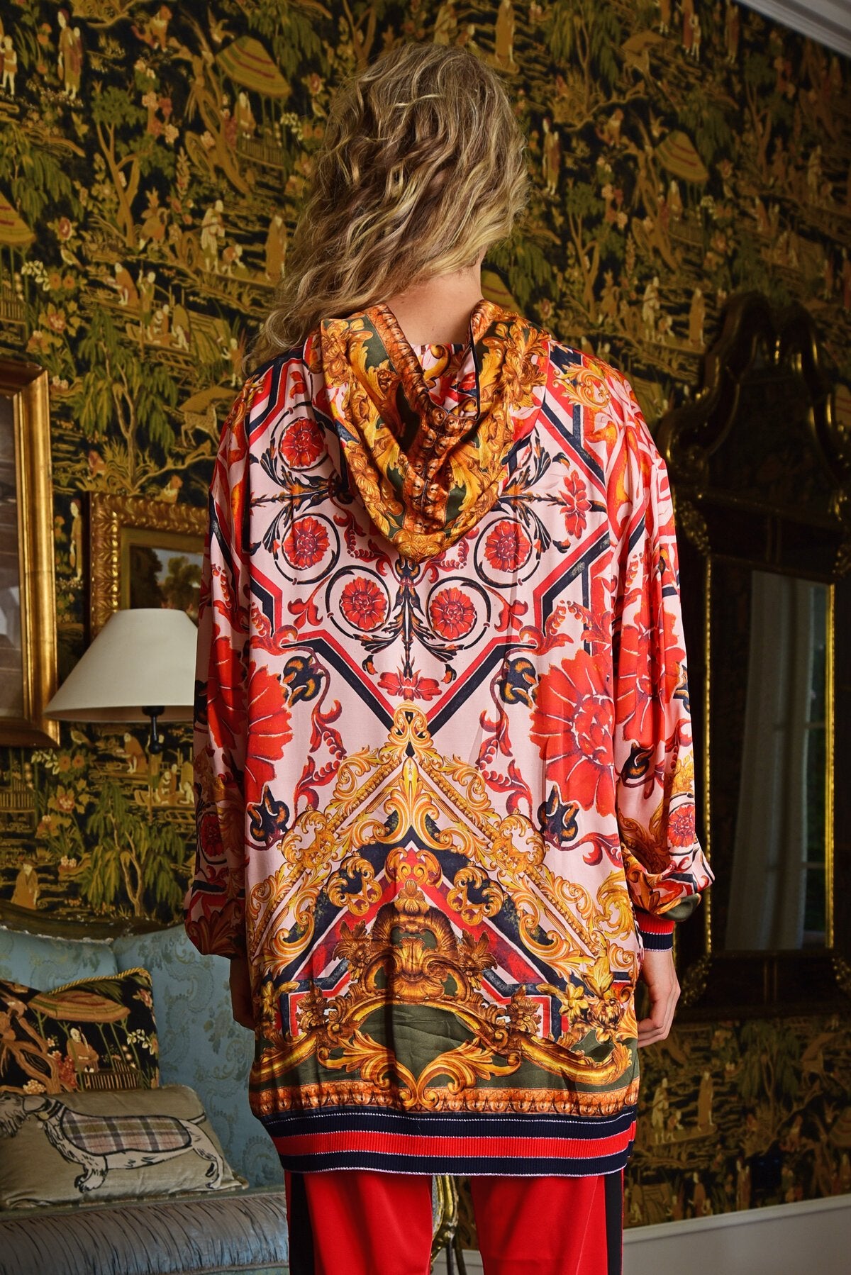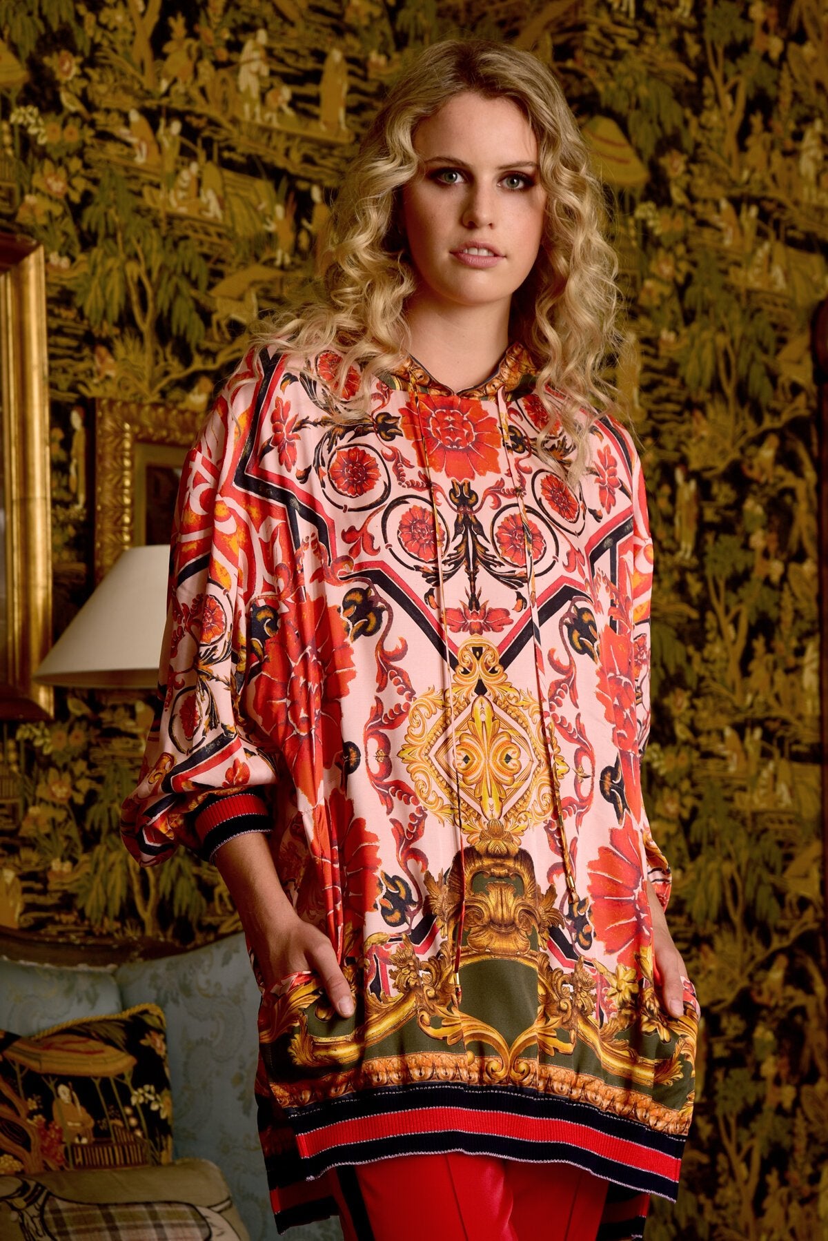 The ‘Class Half Full Hoody’ is the epitome of urban-chic! Designed in the ‘It’s A Scarfing Matter’ viscose satin this beautifully vibrant piece brings an element of cool glamour this season. Featuring a drawstring hood, contrasting ribbed cuffs and hem and practical side pockets this hoody is perfect for looking put together on the go.