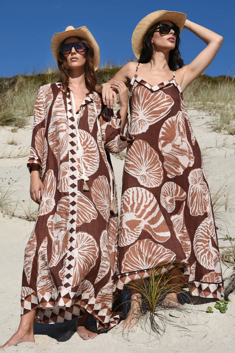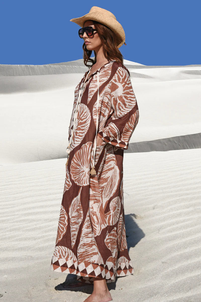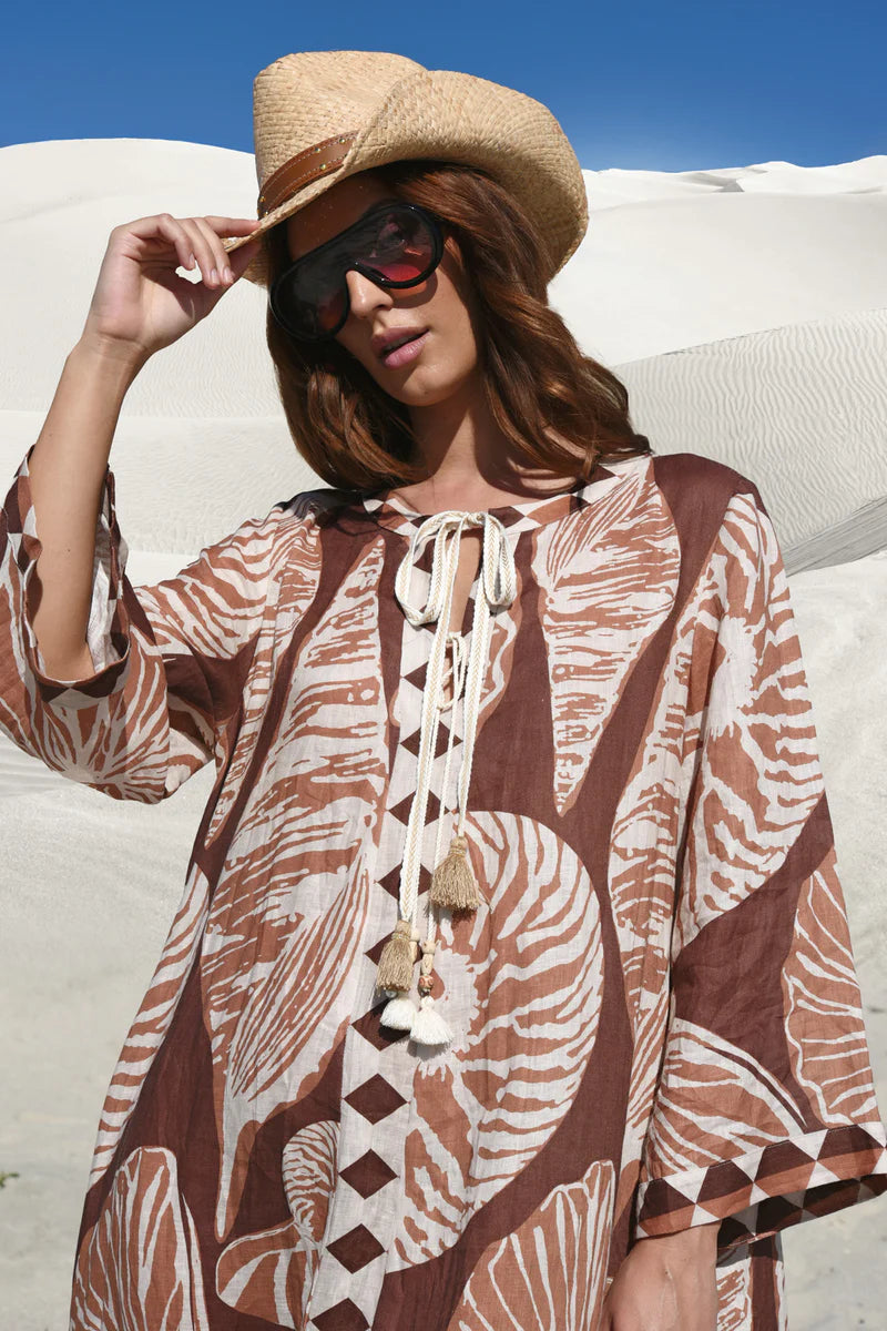 Celebrate warm weather dressing with fabrications aptly designed for summer in the ‘Got You Covered’ dress. Crafted in the ‘By the Sea Shore’ linen fabrication this dress offers a notched neckline, flared sleeves and side pockets, finished with a double tie closure with fringe, sure to make a visually striking impact, no matter the occasion.