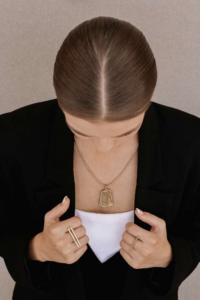 Handmade Dog Tag necklace. Using shapes to find expression. French Made. Vermeil 14 Carat Gold Plated. Dog Tag Measurements - 35mm long x 17mm wide. Chain Measurement – 48cm long.