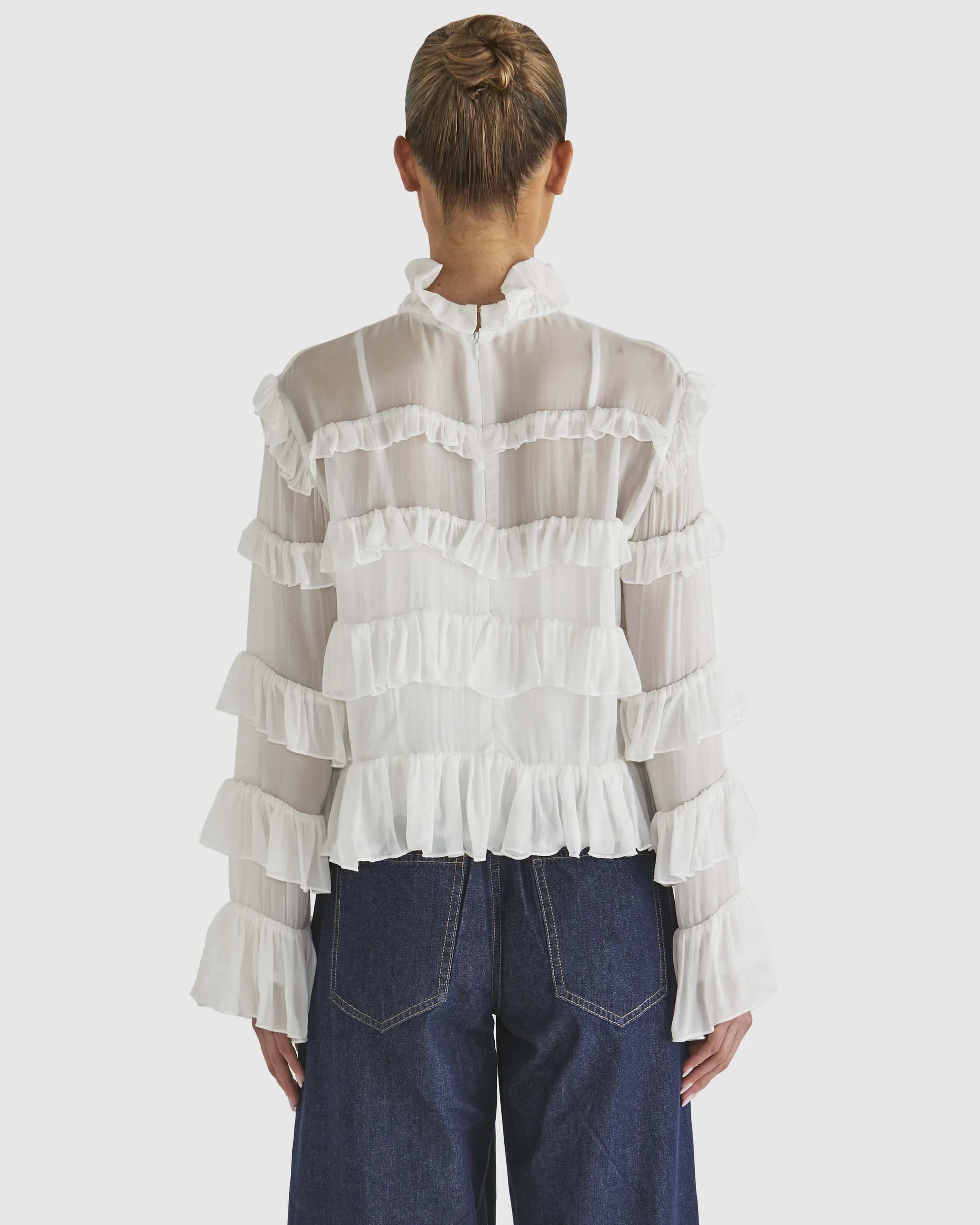 he Decadence Top is a study in refined elegance, featuring a high-neck frill detail and centre-back invisible zip opening. A detachable cami ensures versatility, while the soft georgette fabrication creates an airy, sophisticated drape. Designed for a regular fit, this top is perfect for effortless evening styling. A polished piece with timeless appeal.