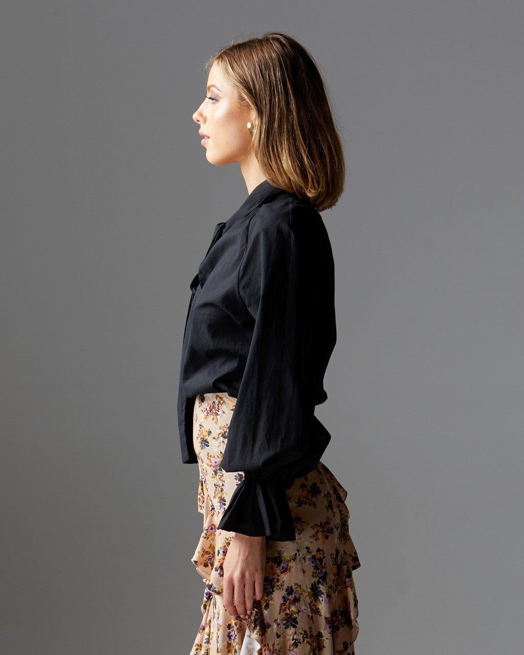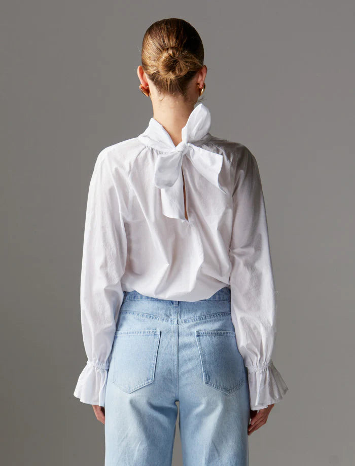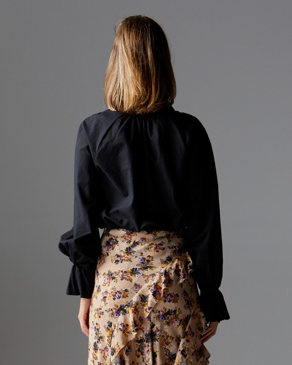 This regular fit reversible blouse features a chic neck tie detail and long puffy sleeves, offering a blend of elegance and versatility.
