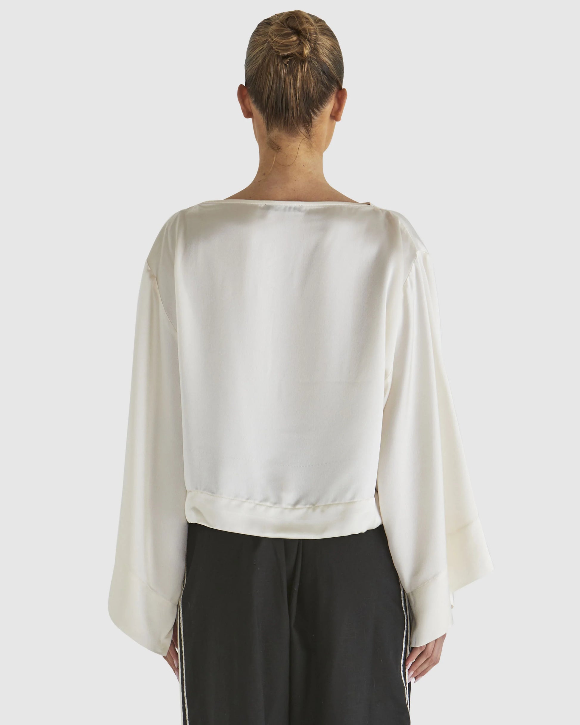 Statement-making yet effortlessly wearable, the Glow Top features wide kimono sleeves and a drapey satin fabric. A wide hem detail enhances its fluid silhouette, while the oversized fit creates a relaxed yet elevated look. Perfect for layering or wearing on its own, this piece exudes understated glamour. A sophisticated staple for modern wardrobes.