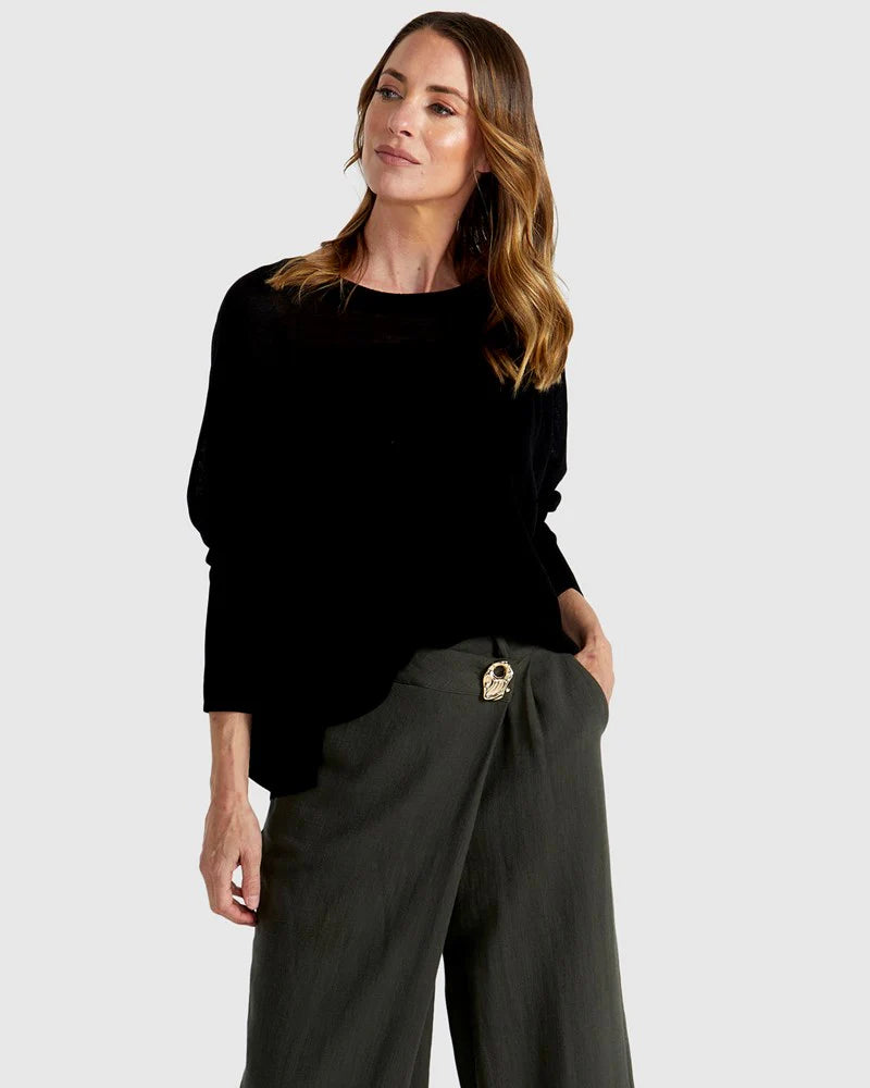 The Clarity Knit offers a sophisticated yet relaxed look with a boat neckline and a hi-low hem with side splits. The soft knit and dropped shoulder detail make this piece both chic and refined, perfect for adding warmth and elegance to your winter wardrobe.