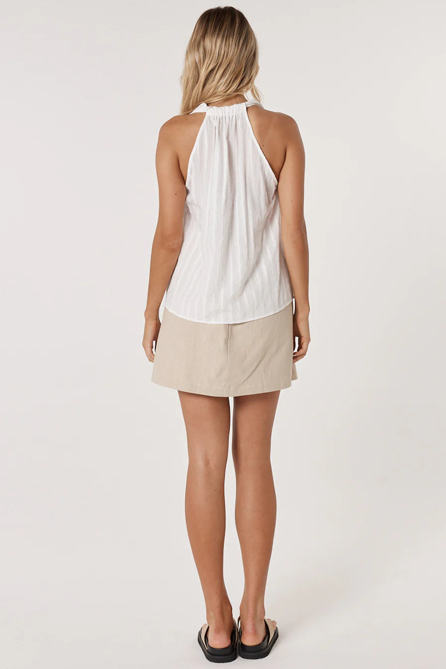 The Lyra Tank is a minimalist staple with a refined edge. Designed with a V-neckline and subtle textured fabric, it offers clean lines and an elevated finish. Perfect for layering or wearing alone, it embodies effortless sophistication.