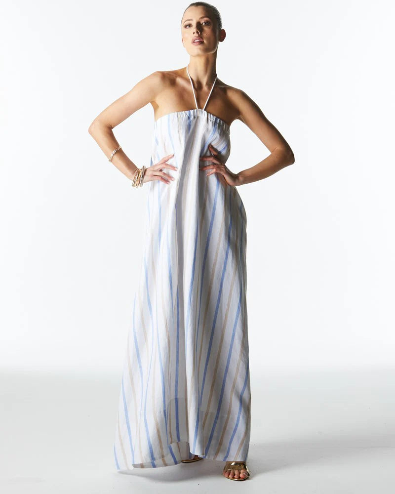 The Poolside Boxy Dress offers a relaxed elegance with its bust-line elastic, side zip, and removable adjustable straps. A rope waist tie completes this refined yet playful design, ideal for sophisticated summer days.