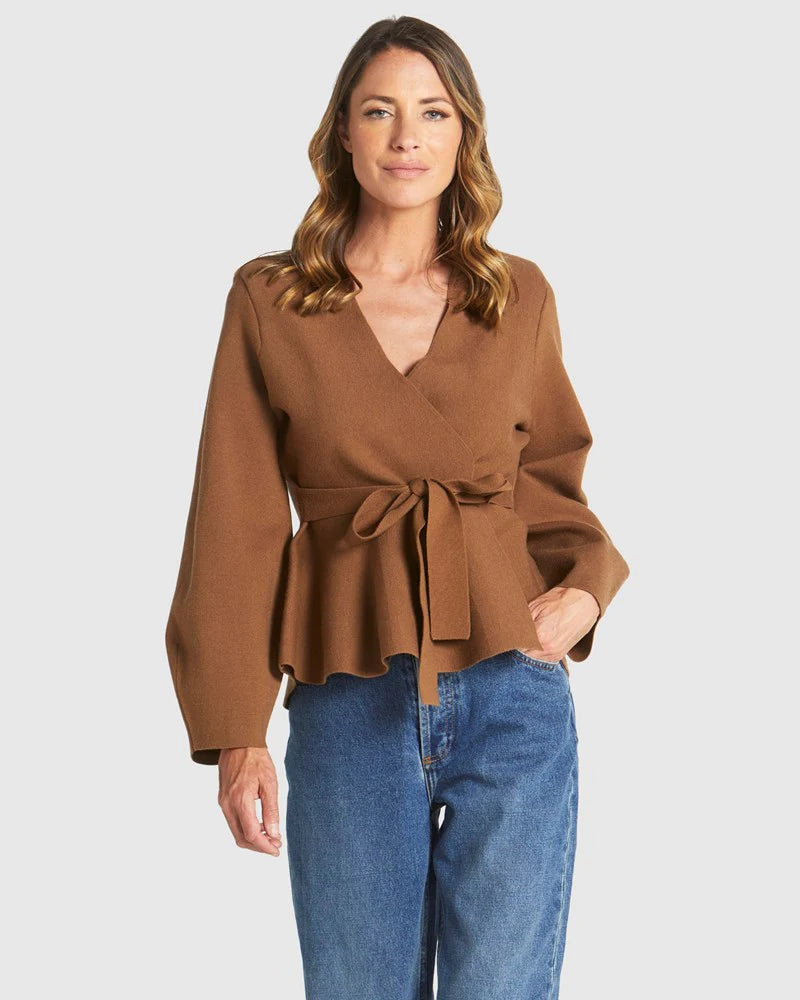 The Tiny Dancer Wrap Cardi is a chic and versatile top that elevates everyday dressing. Featuring shoulder pads, a wrap style closure, and a knitted finish, it offers comfortable wear and a regular fit. An effortlessly polished layering piece.