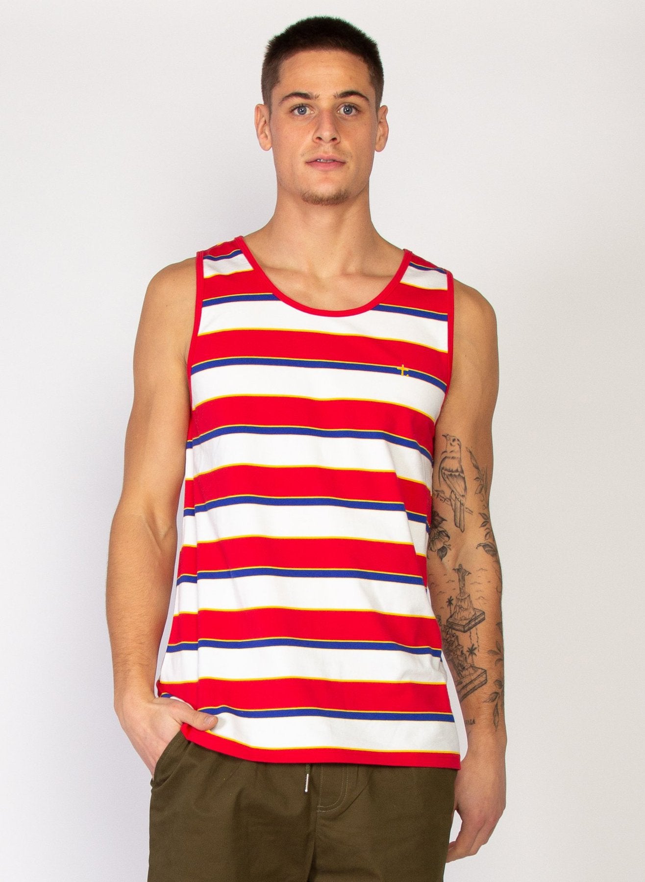 The break singlet is a must-have summer piece. Finished off with a cool red, blue and white stripe.