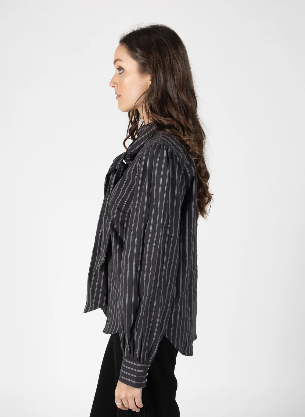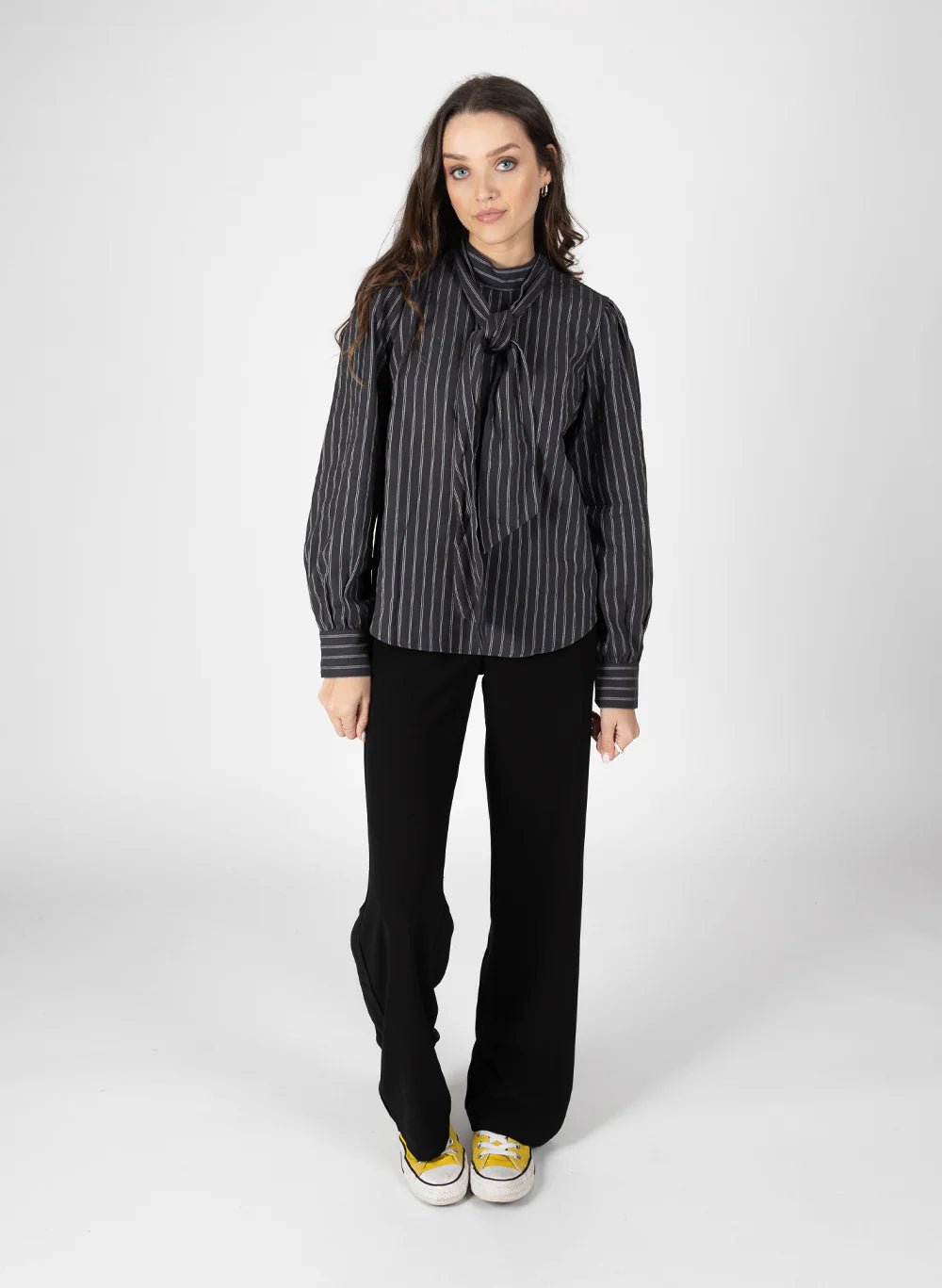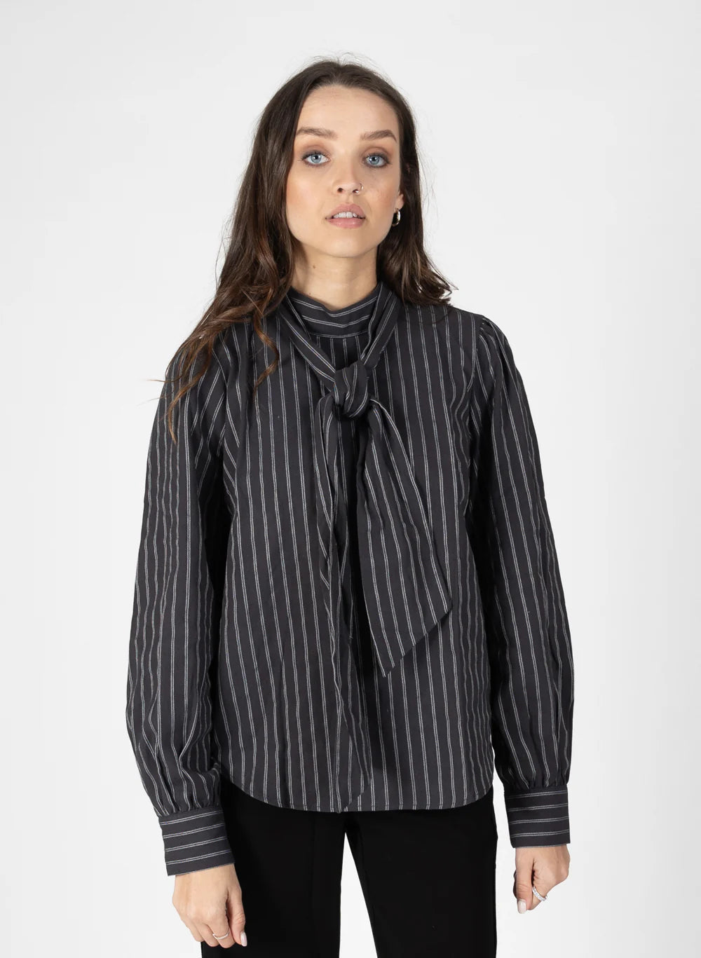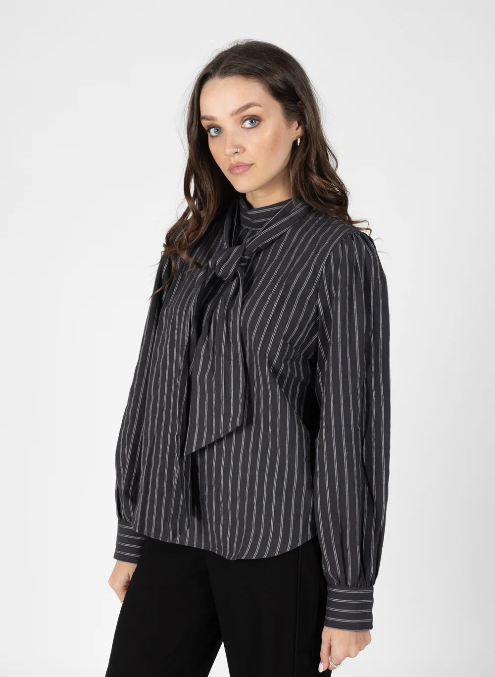 Its just a no brainer, a smart top you can dress up or down, cute detailing with the tie and in two colour ways, pin stripe or plain black...