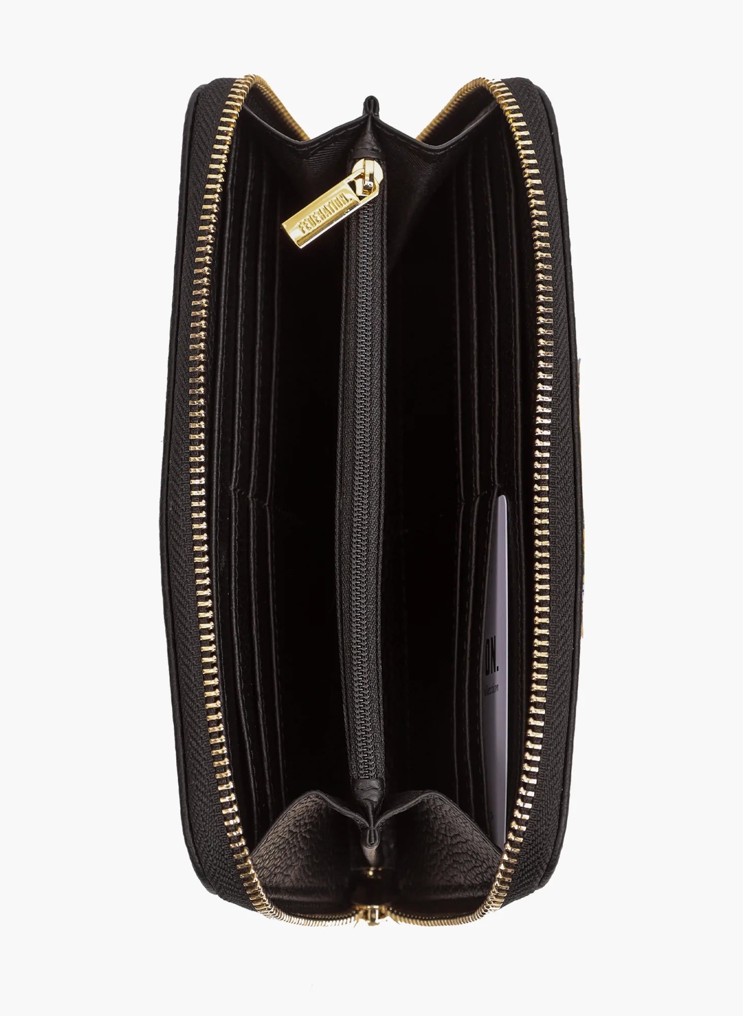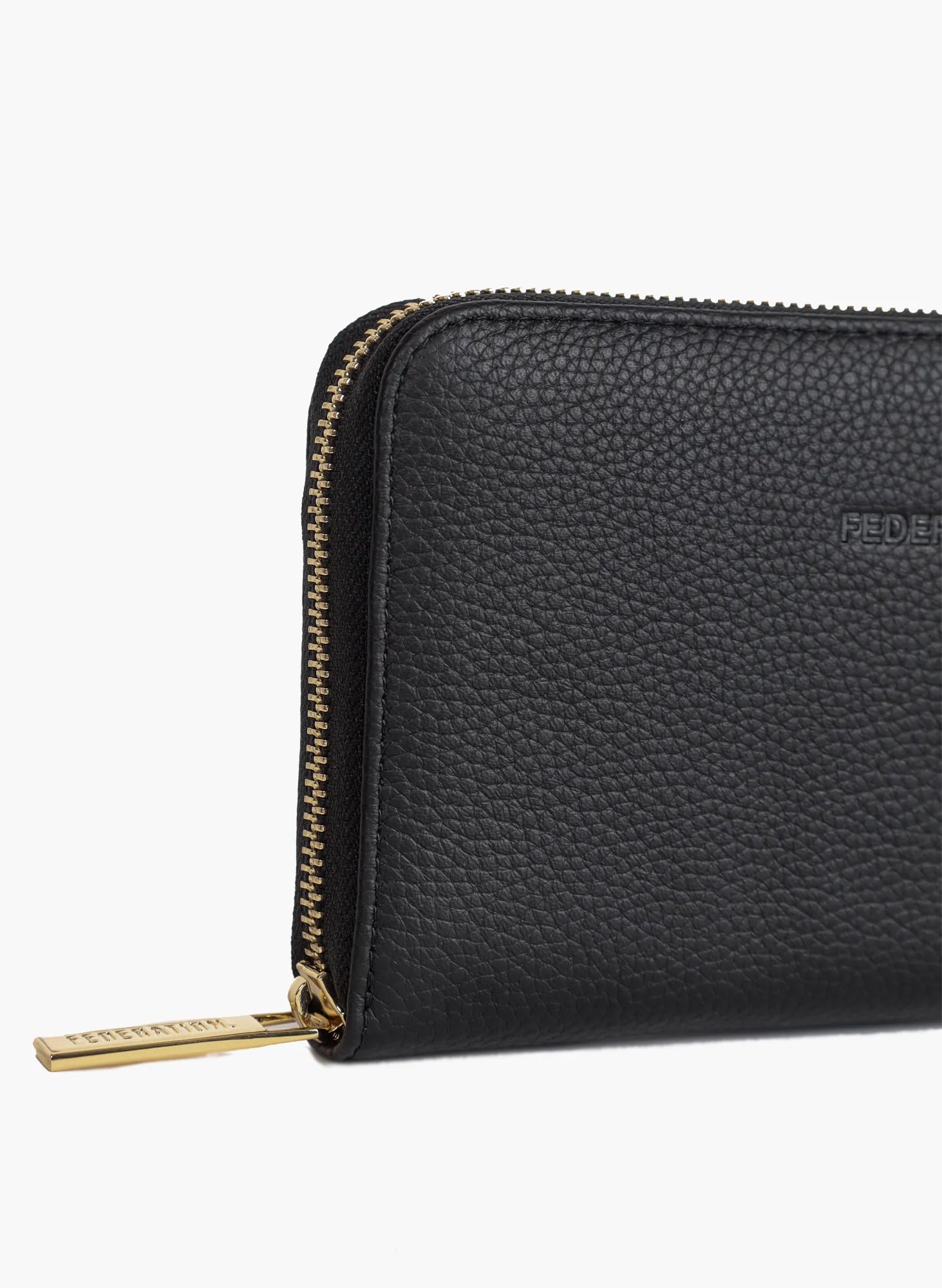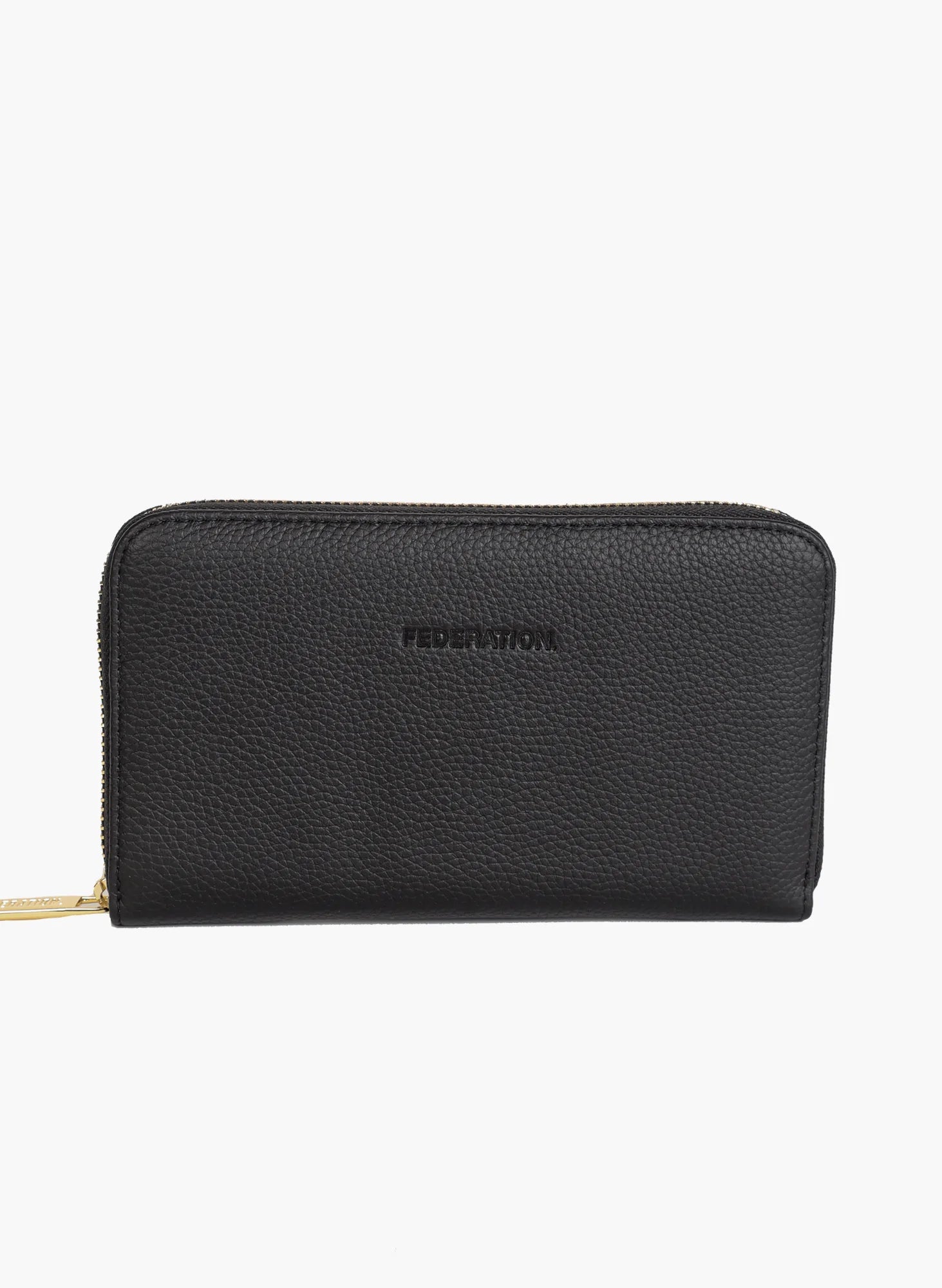Gold embossed federation zip pull and embossed leather branding complete the details. All wallets come in a white printed tie detail dust bag.
