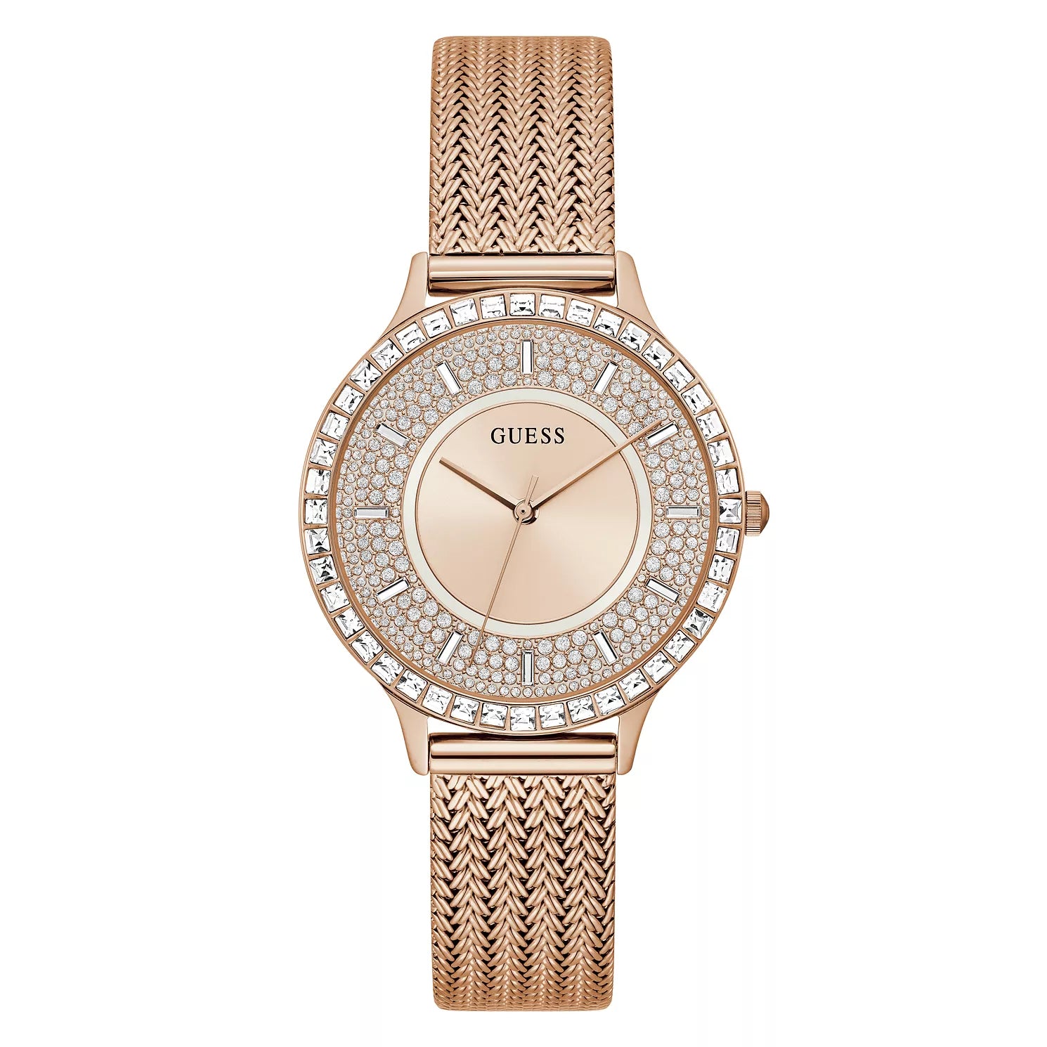 This striking Soiree design timepiece by Guess will add a touch of glamour to any outfit. It's enchanted dial design is embellished with crystals and accents then stylishly set on a rose gold slip through adjustable mesh bangle.
