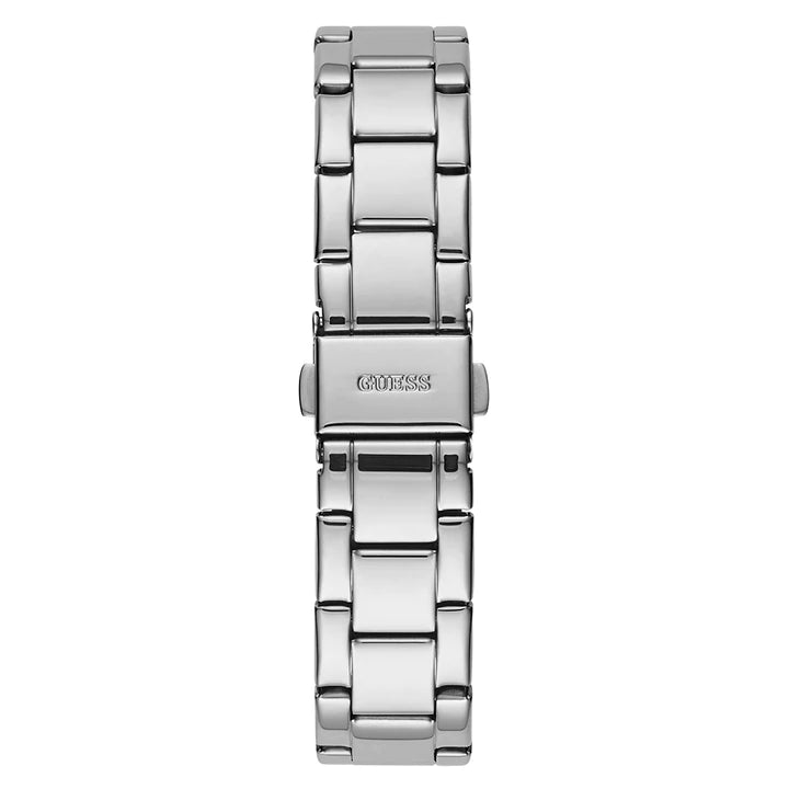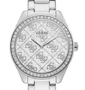 The Guess Ladies Sugar watch features a silver crystal set stainless steel case and silver bracelet strap. The bezel is set with a row of crystals which offset the silver glitz logo dial. The watch is water resistant to 3ATM.