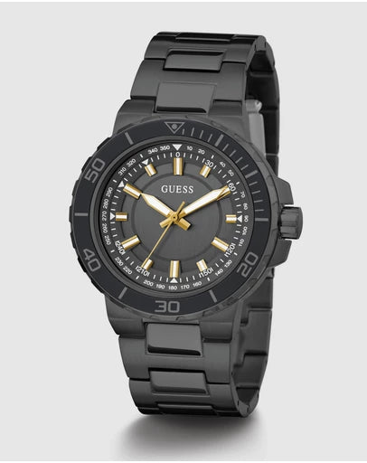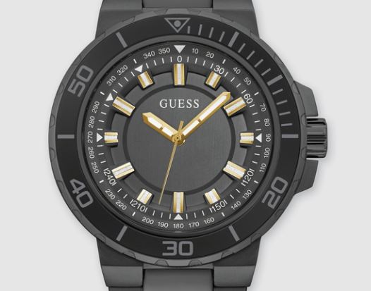 Utility at its finest with this simple but sleek Track watch by Guess. Featuring an all over black-tonal look, rose gold baguette markers that highlighted against the black dial. Finished off on a brushed stainless steel black bracelet.