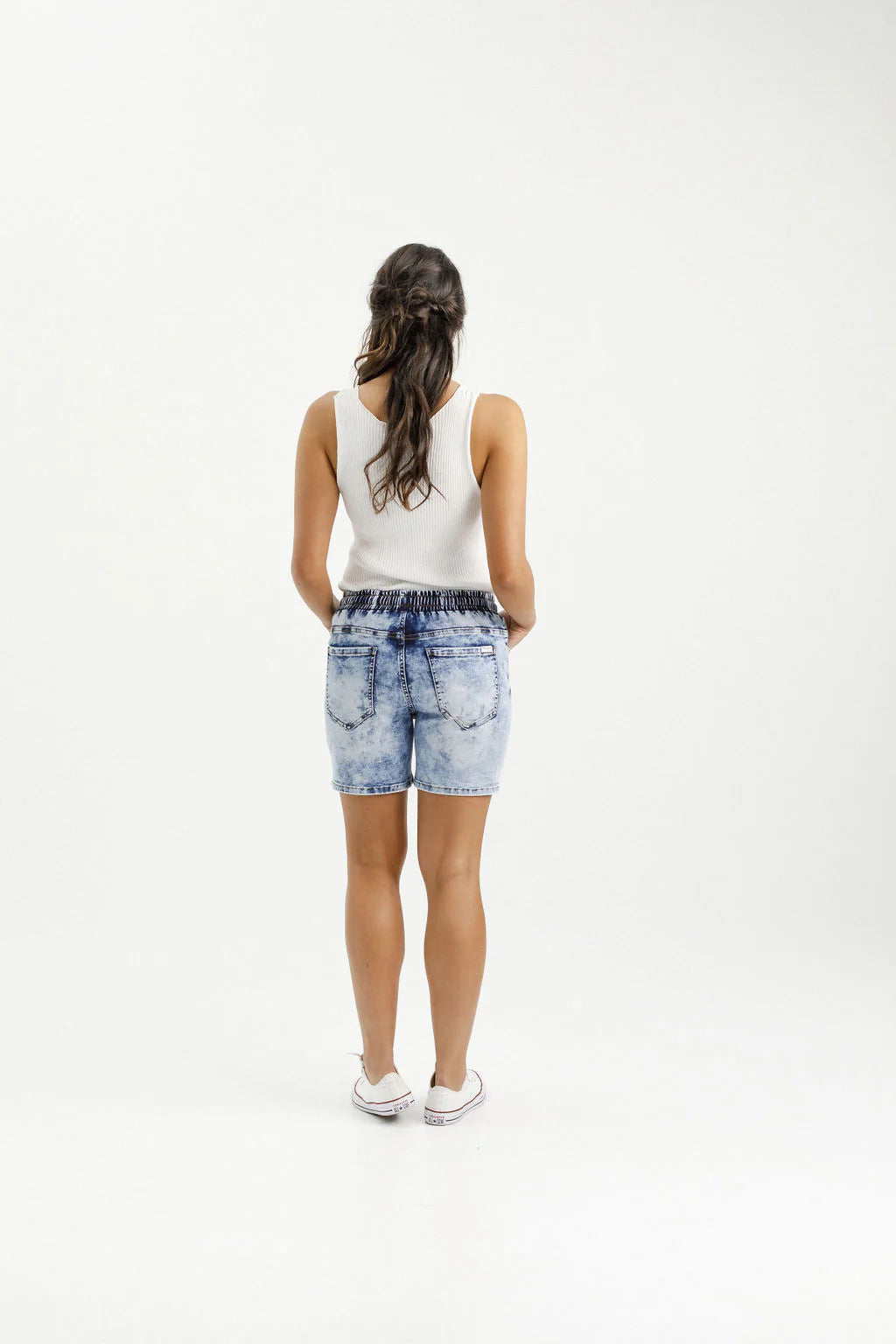 Featuring an elasticated waist with white drawstring, pockets and straight cut hem on the leg. These mid thigh shorts are long and more fitted than our Lagoon Short.