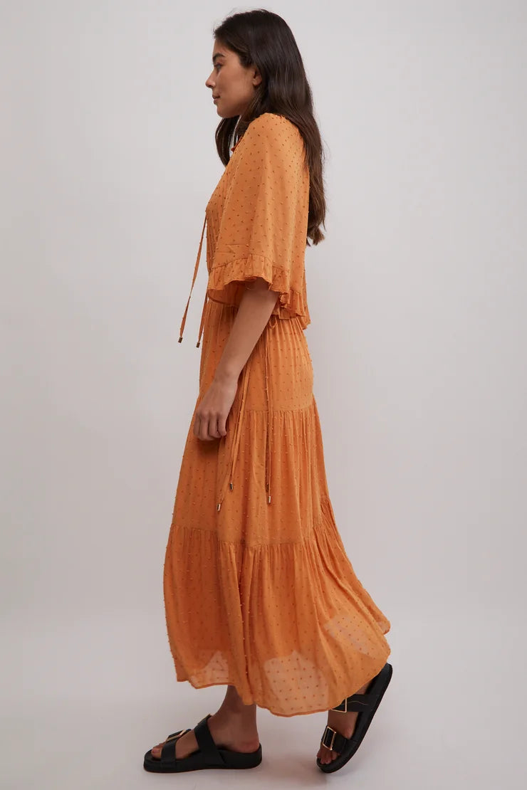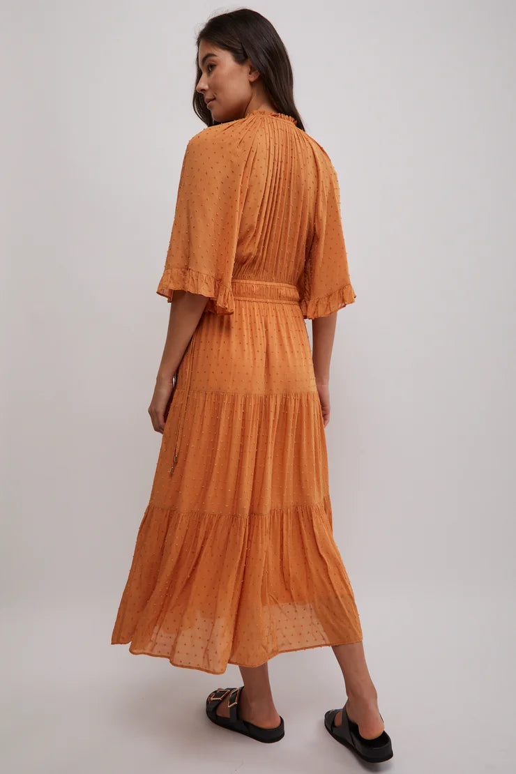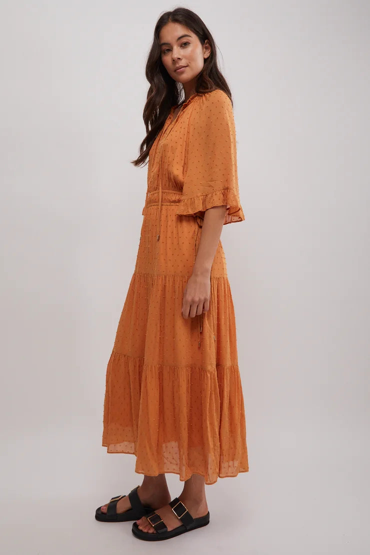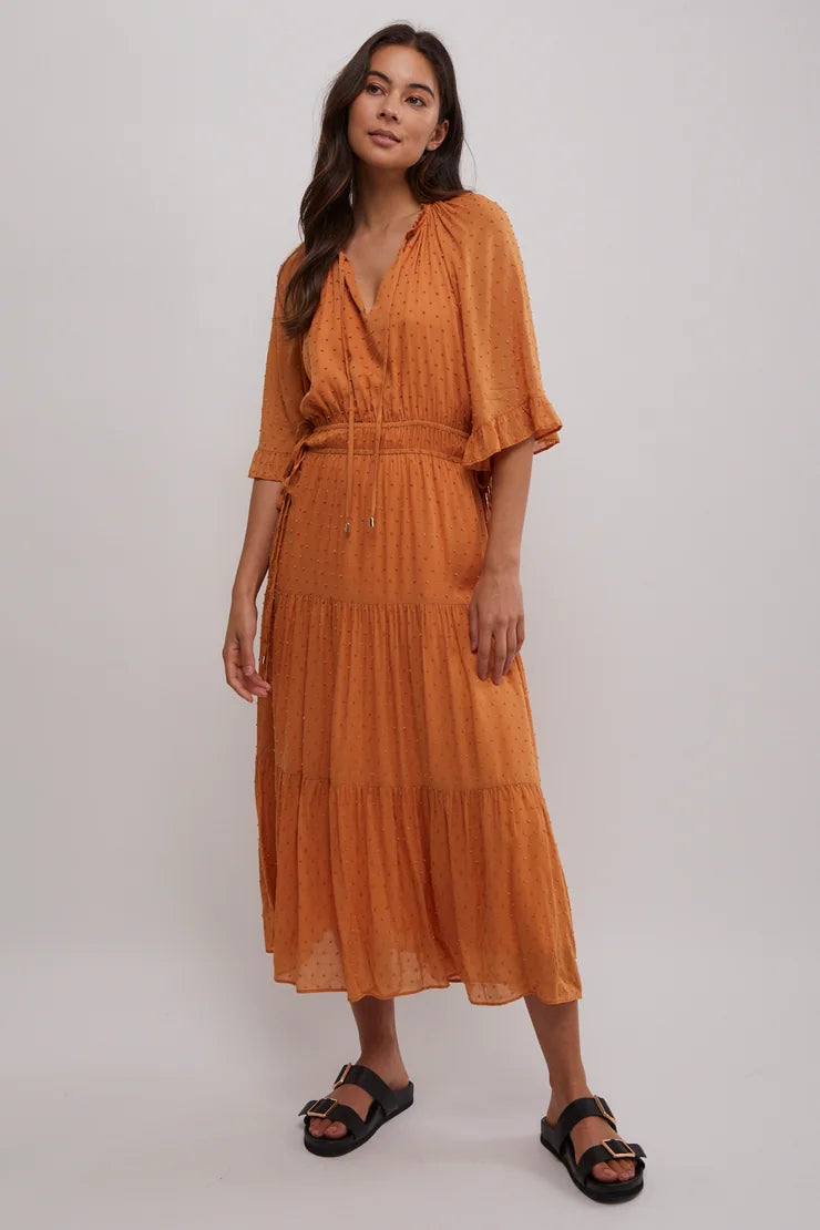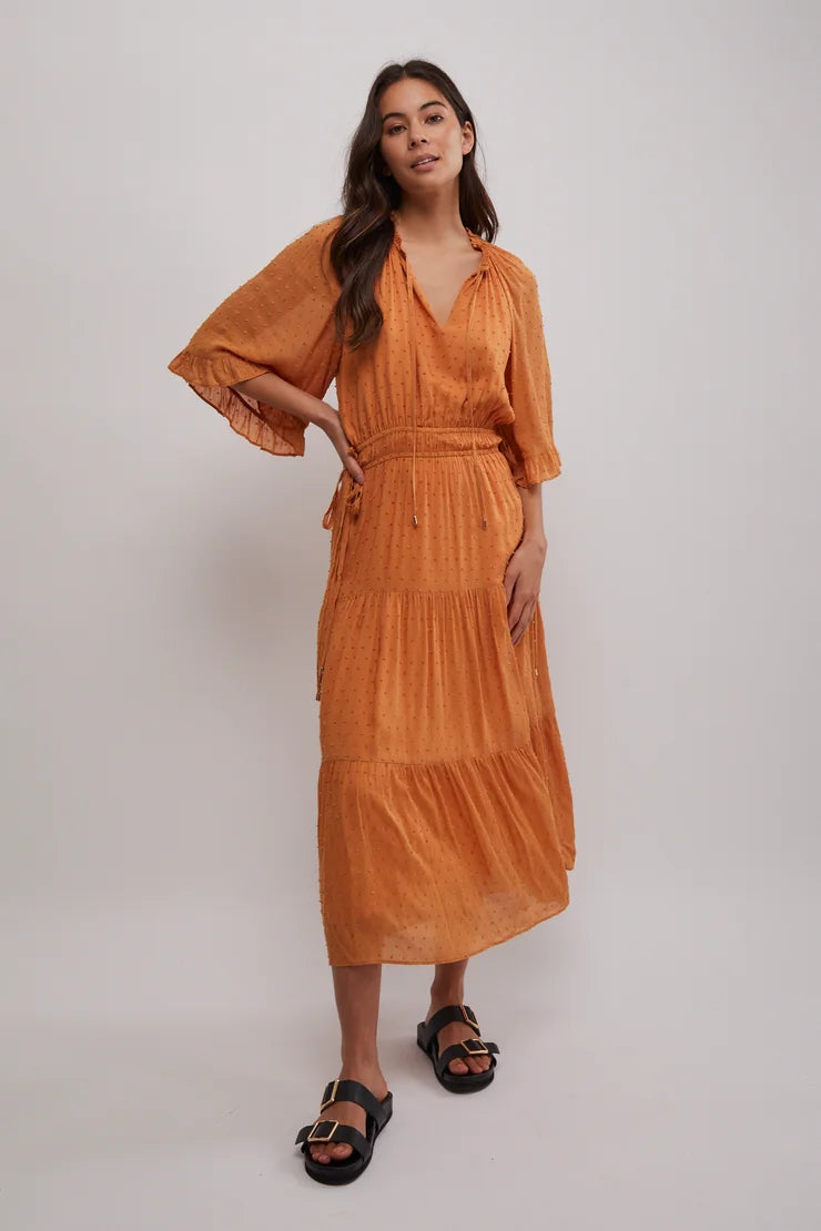 Warm tones and fun textures, the Dahlia Midi Dress from Minkpink offers the perfect garm' for Christmas parties and summer barbies. All the features to please like 3/4 flared sleeves, adjustable tie to the waist and a long tiered skirt.