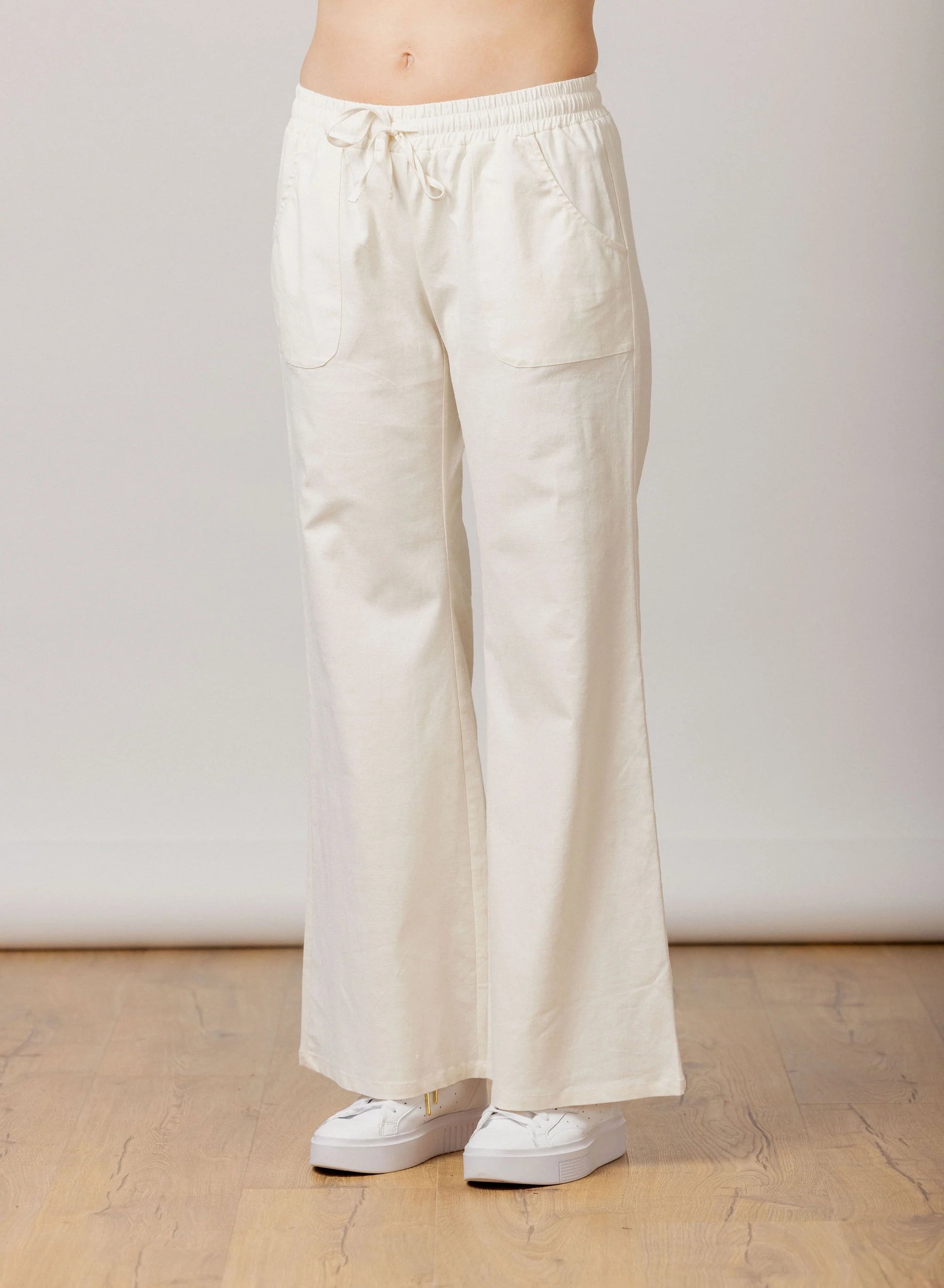 These soft linen blend pant from Moss by Mi Moso are a wide leg with front pockets and elastic wasitband with tie. 3% Spandex, 30% Linen & 67% Viscose