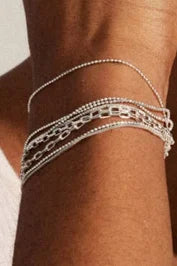 Eight chains in one layered bracelet, that's what we call, easy and effortless stacking. A mix of beaded chains, micro cable chains and box chains come together to create this fully stacked bracelet.