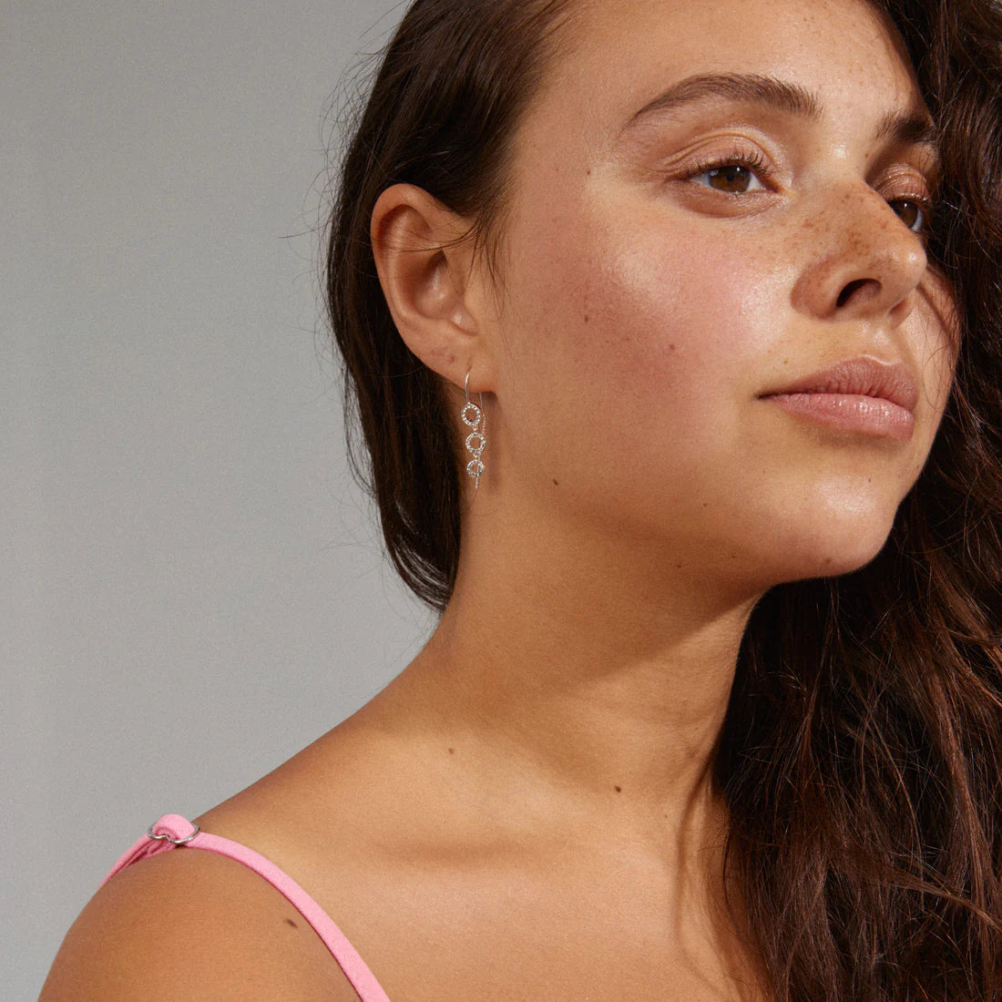 Elegance is key! Silver-plated chain earrings with a pendant consisting of three circular halos, decorated with sparkling Preciosa crystals. Are you ready to show your unique fashion style? Then combine them with several dashing pieces and add some serious sparkle to the party. The earrings are made from a min. of 75% recycled material.