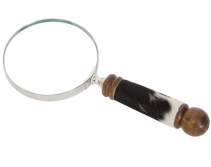 SMALL DÉCOR CAN REALLY ADD CHARACTER AND STYLE TO ANY SPACE. THIS BRASS ALUMINIUM MAGNIFIER W/ HIDE & WOOD HANDLE IS A DECORATIVE ITEM FOR LIGHT USE ONLY, THE UNIQUE DESIGN OF THIS MAGNIFIER GLASS MAKES IT A CLASSIC