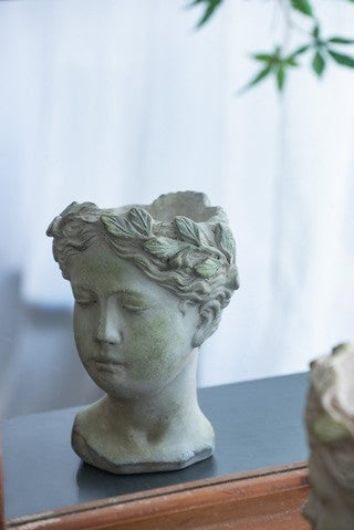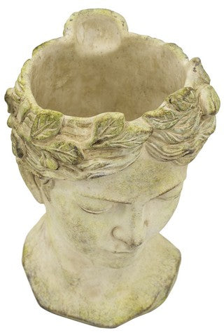 Reminiscent of the Victorian era, this cement planter depicts a serene woman with a floral crown. Artistic and breathtaking to look at, this mossy finished cement planter only becomes more beautiful with the addition of your flowers or plants.