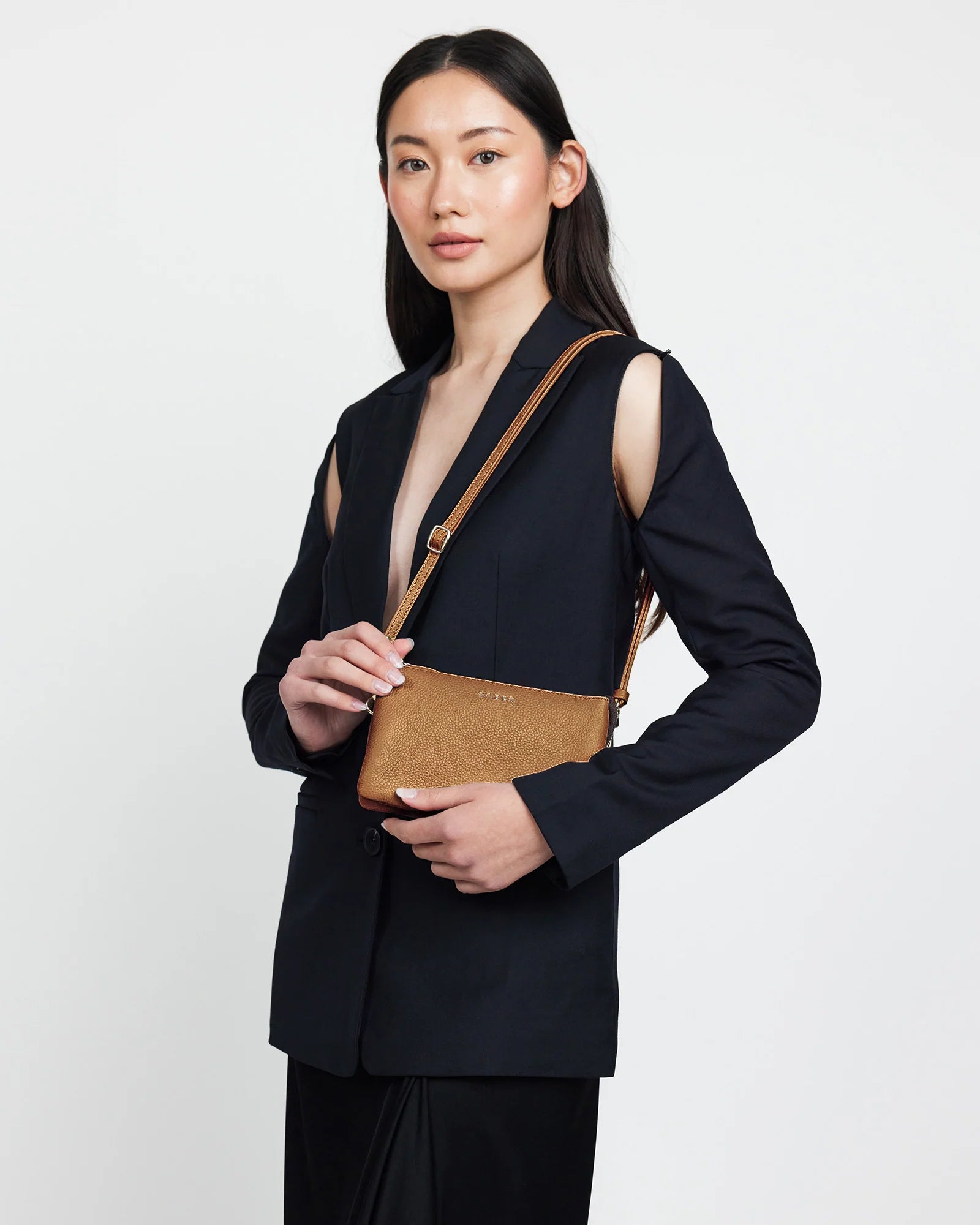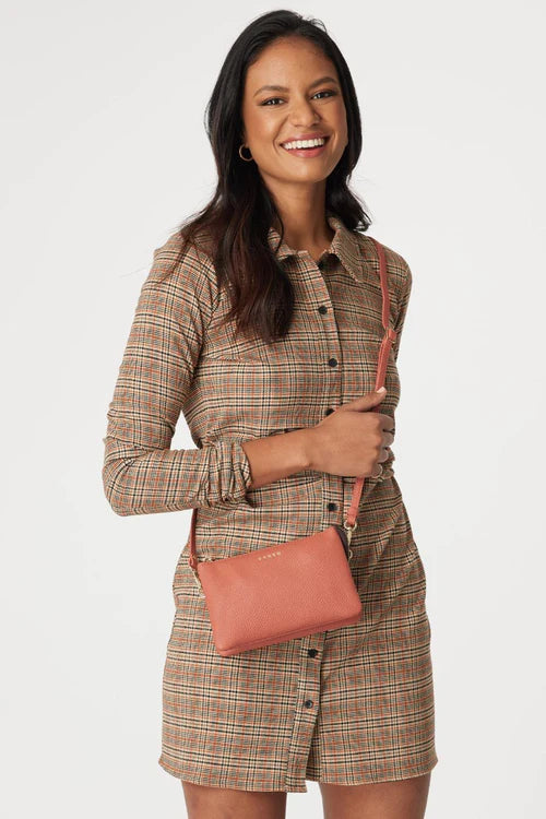 Wallet, clutch, and crossbody Saben staple, Tilly is a tri-factor, and the linchpin to keeping your life in order. A bag that works as hard as you do. Bunked in your big bag as a wallet, worn as a clutch with the wristlet strap or utilize it as a petite yet highly productive cross-body handbag with the ease and elegance of the cross-body strap. Need we say more? Zip-to-lock wallet with two internal drop pockets, internal zip pocket, 6 drop card slots, detachable wrist strap and cotton drill lining. 13 tall x 20 wide x 3 deep cm