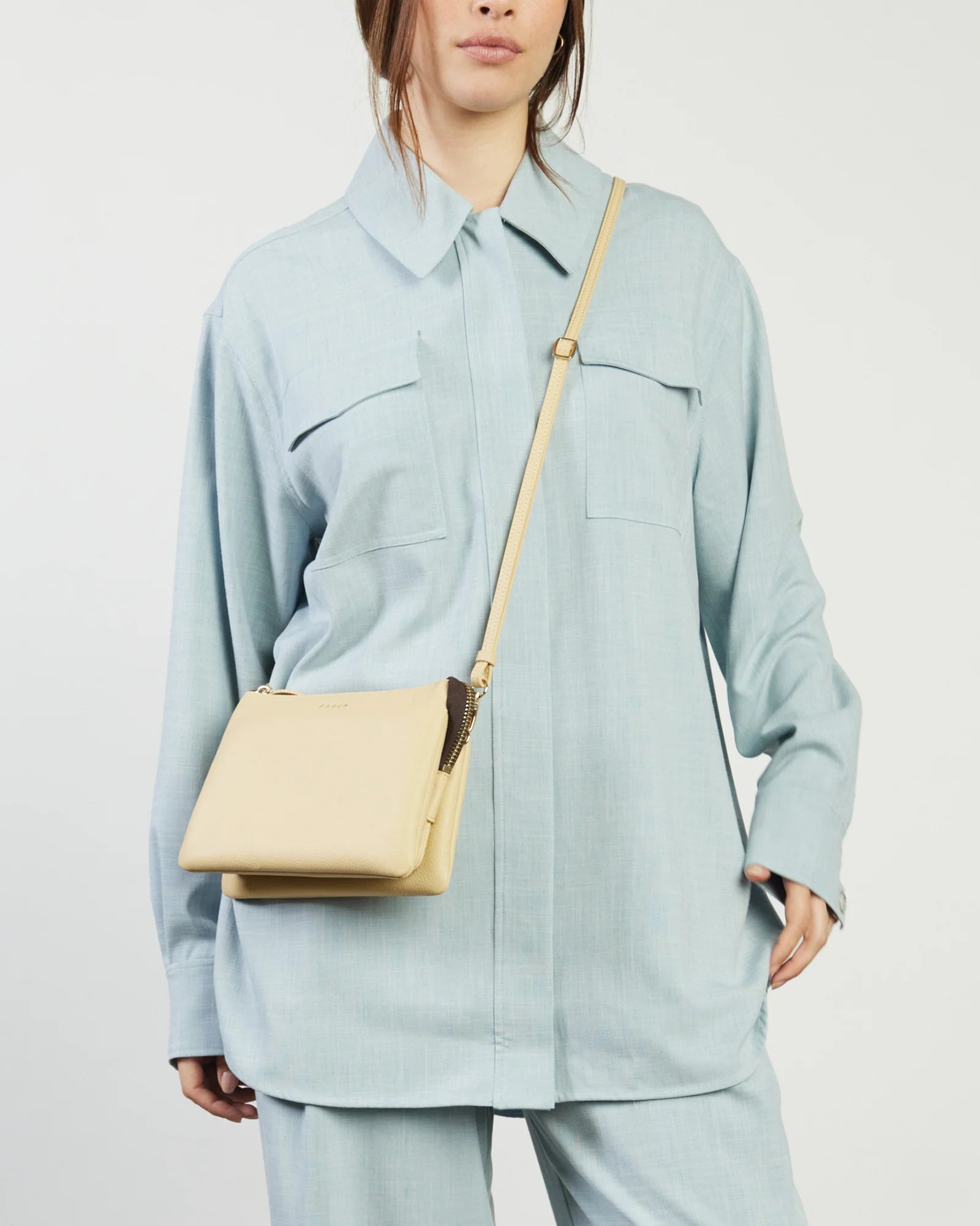 Details: Detachable and adjustable long leather strap to be worn over the shoulder or across the body; six drop card slots; gold plated hardware; interior secure zip pocket; outer zip fastening.