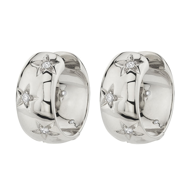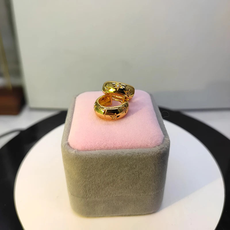 Well hello you classy little star studded huggie earrings! Created with a sterling silver base and utilizing luxury 14 karat gold plating or sterling silver option.