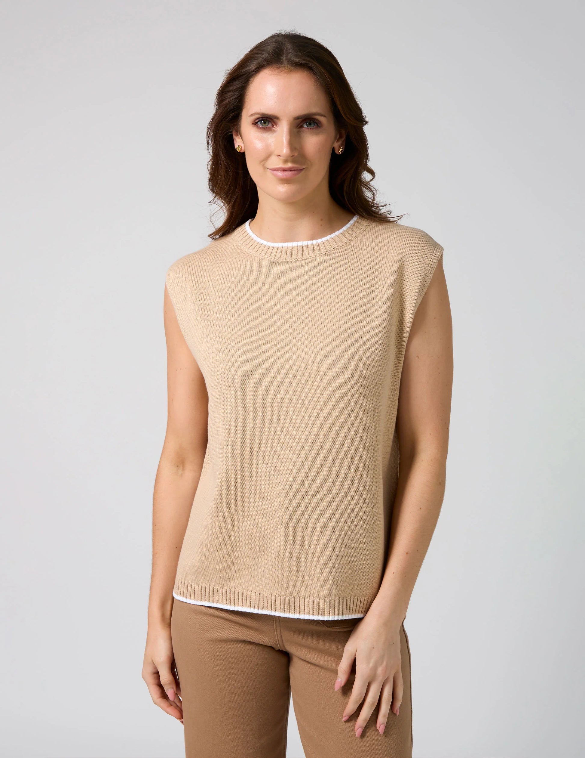 Crew neck sleeveless knit, with jersey body and rib trims and contrast tipping trim on neckline and hem