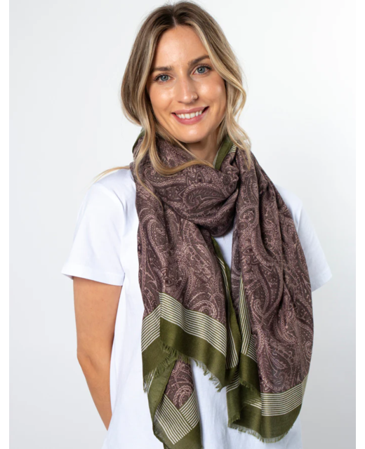 Gorgeous paisley printed scarf in rose with fern stripe trim. Don't be cold and ugly, be warm and stylish with Shed and Stella.
