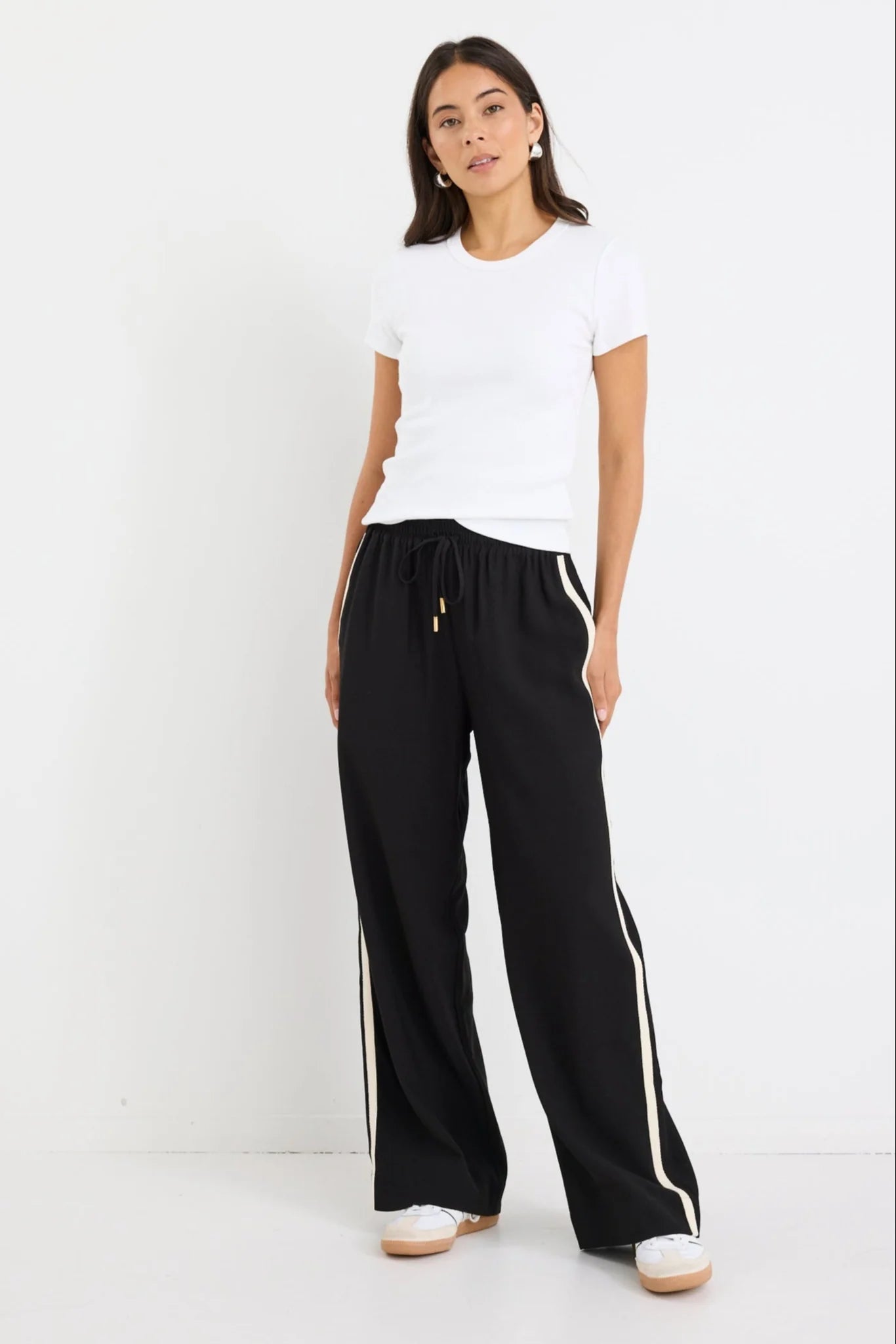 Elevate your everyday with the new and improved Townie Pants. Now crafted from a deeper black fabric and made with a soft-touch viscose blend that's perfect for transeasonal wear. A fresh take on our bestselling Townie style, this updated version keeps the much-loved relaxed fit while introducing refined details like a gorgeous gold tie detail end, for a modern edge. Whether you're dressing them up or keeping it casual, these pants are your new go-to for effortless sophistication.