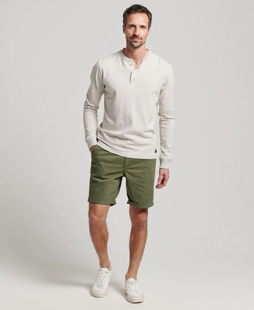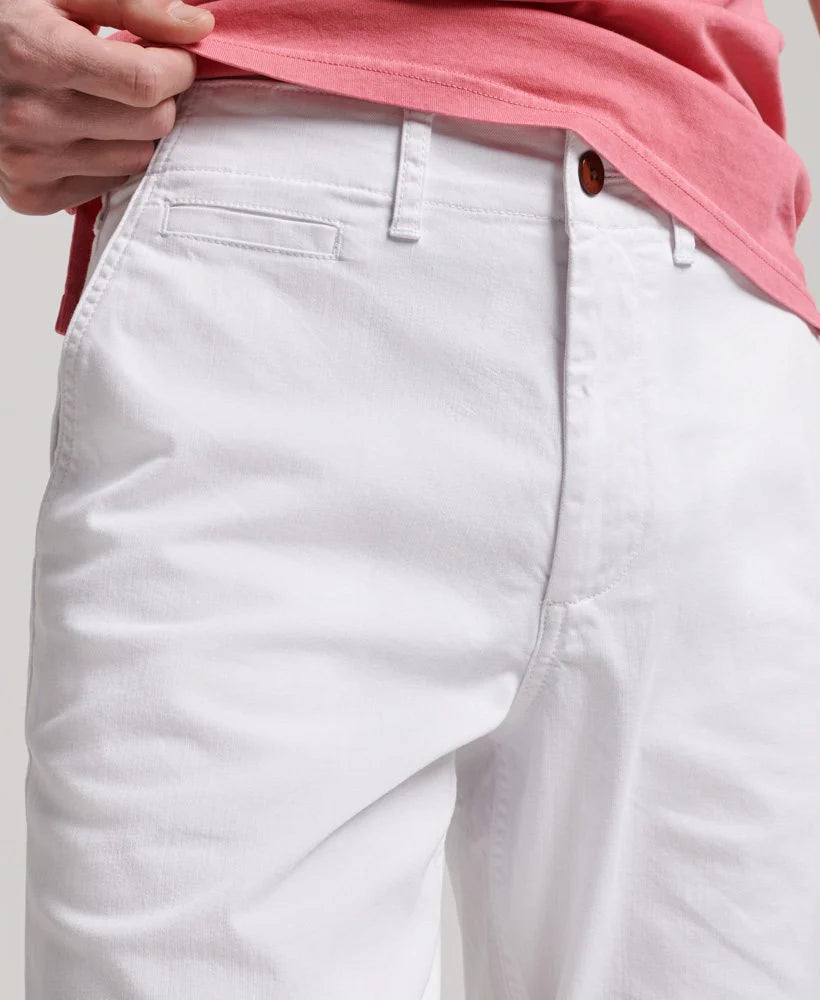 Classic design and simplistic styling. There's nothing more iconic when the weather starts to warm up than a pair of chino shorts. Made from chino twill fabric, these Officer shorts draw on that military heritage to bring you a hard-wearing yet everyday comfortable style that will allow you to look your best when others are flagging as the mercury rises. Pair with a plain polo or classic cotton shirt for a smart look or dial it back with your favourite tee. Versatility is key and the Officer chino shorts are those that will deliver.