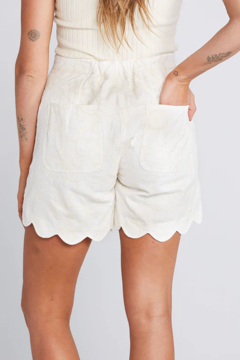 I promise you'll want to wear these every day. The Everyday Short features antique brass rivets and tacks, a scalloped hem, pockets and a zip fly, with a dash of elastic in the back for added comfort.