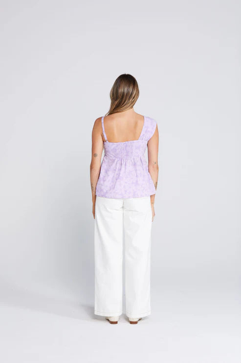 Meet the cute Lexi Top in Violet Daisy. With an elastic back panel for easy wear, this top features a fun design with one wider fabric shoulder strap and a regular strap on the other.